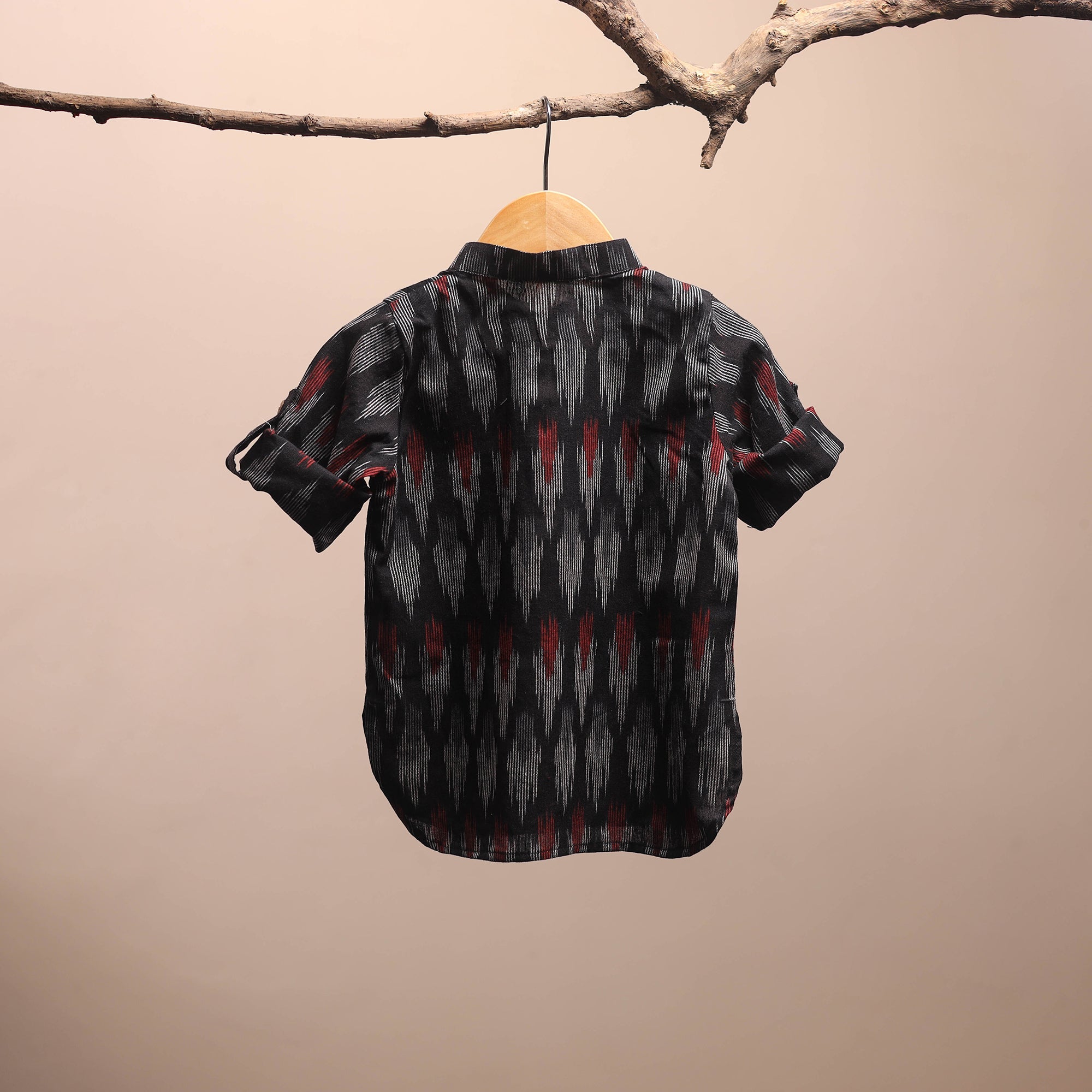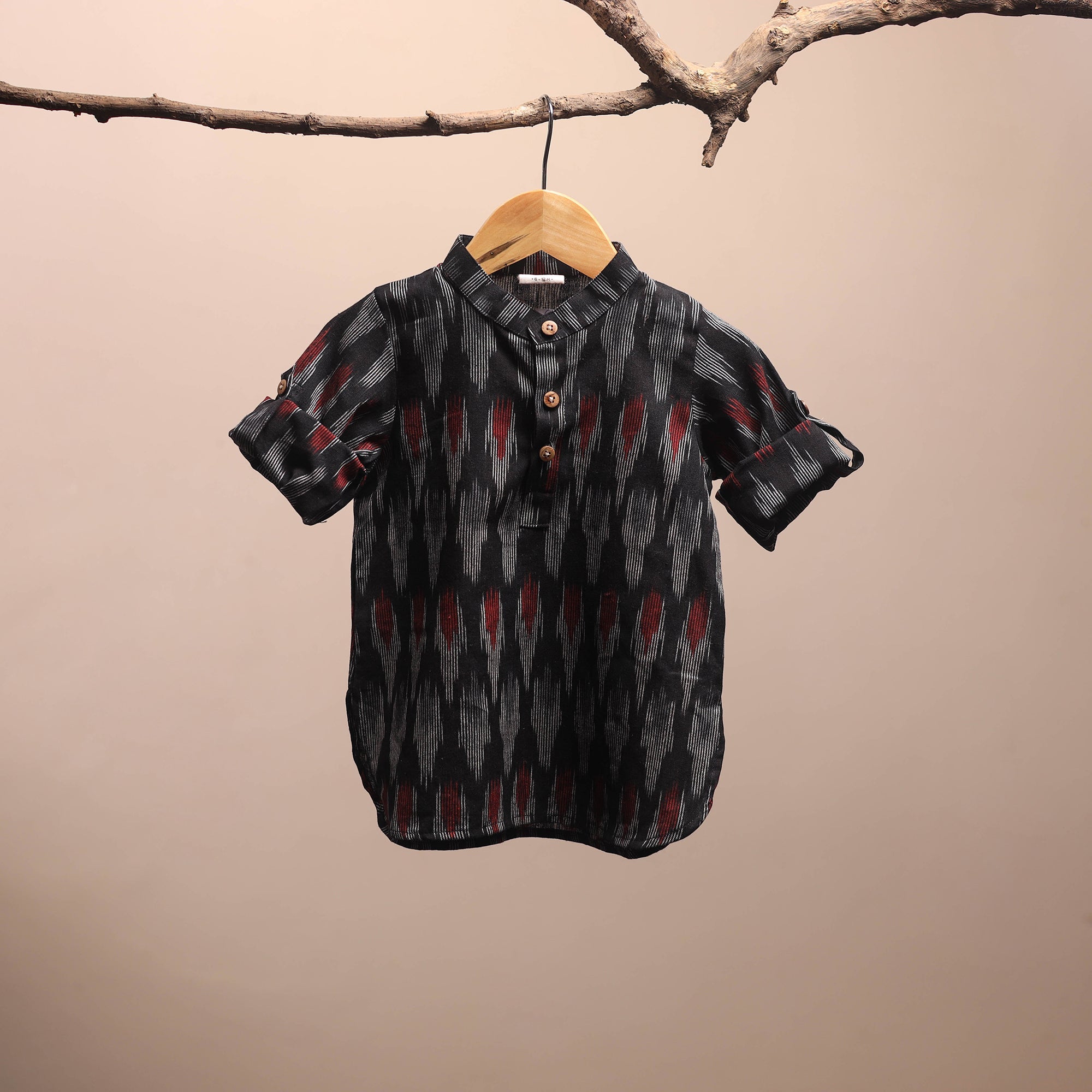This black pochampally Ikat cotton kids' kurta is designed with timeless patterns and vibrant colors, perfect for everyday wear or festive occasions. Made using the traditional Ikat weaving technique from Telangana, it offers comfort with style. Pair it with pajamas or jeans for a versatile look that keeps your little one looking smart and feeling relaxed all day.