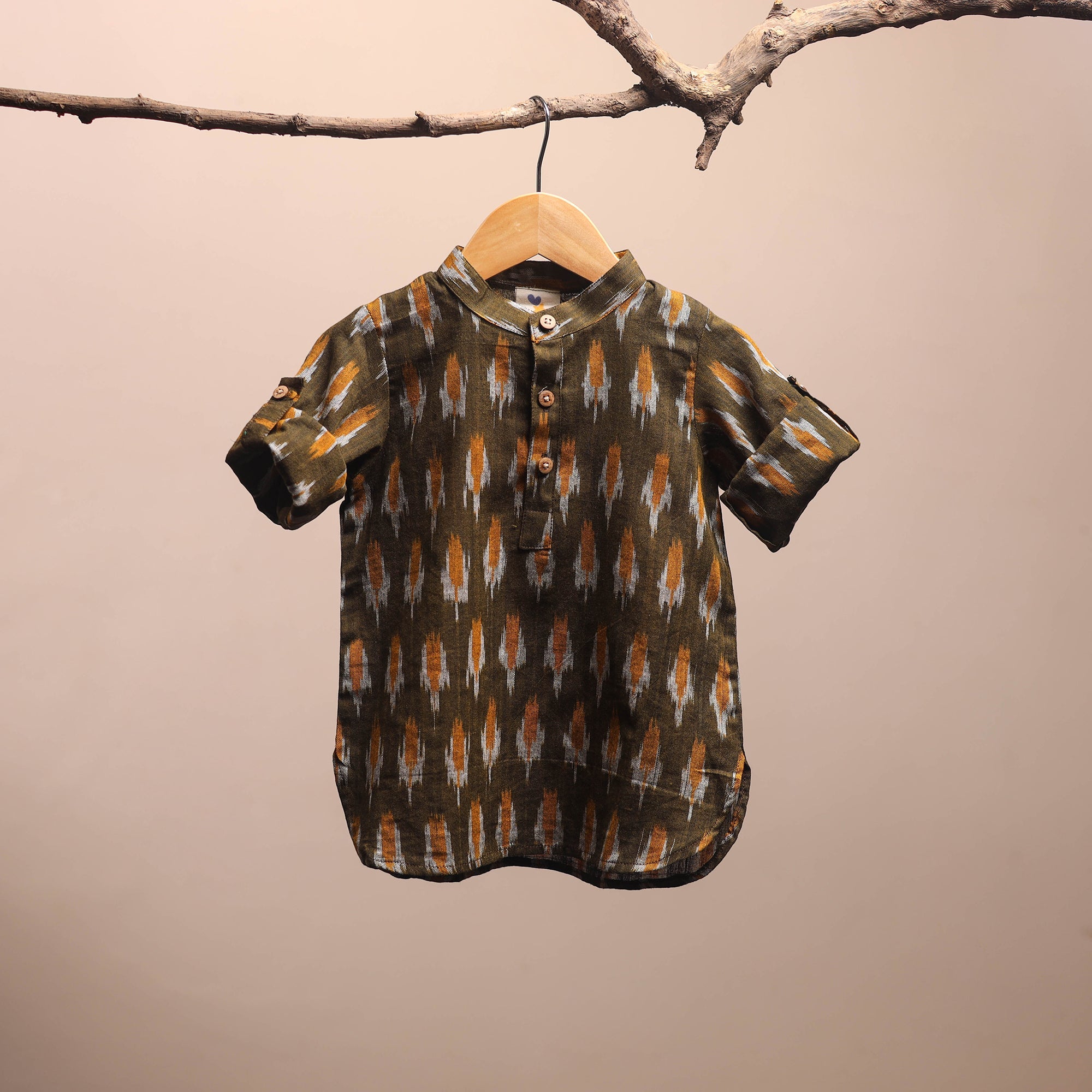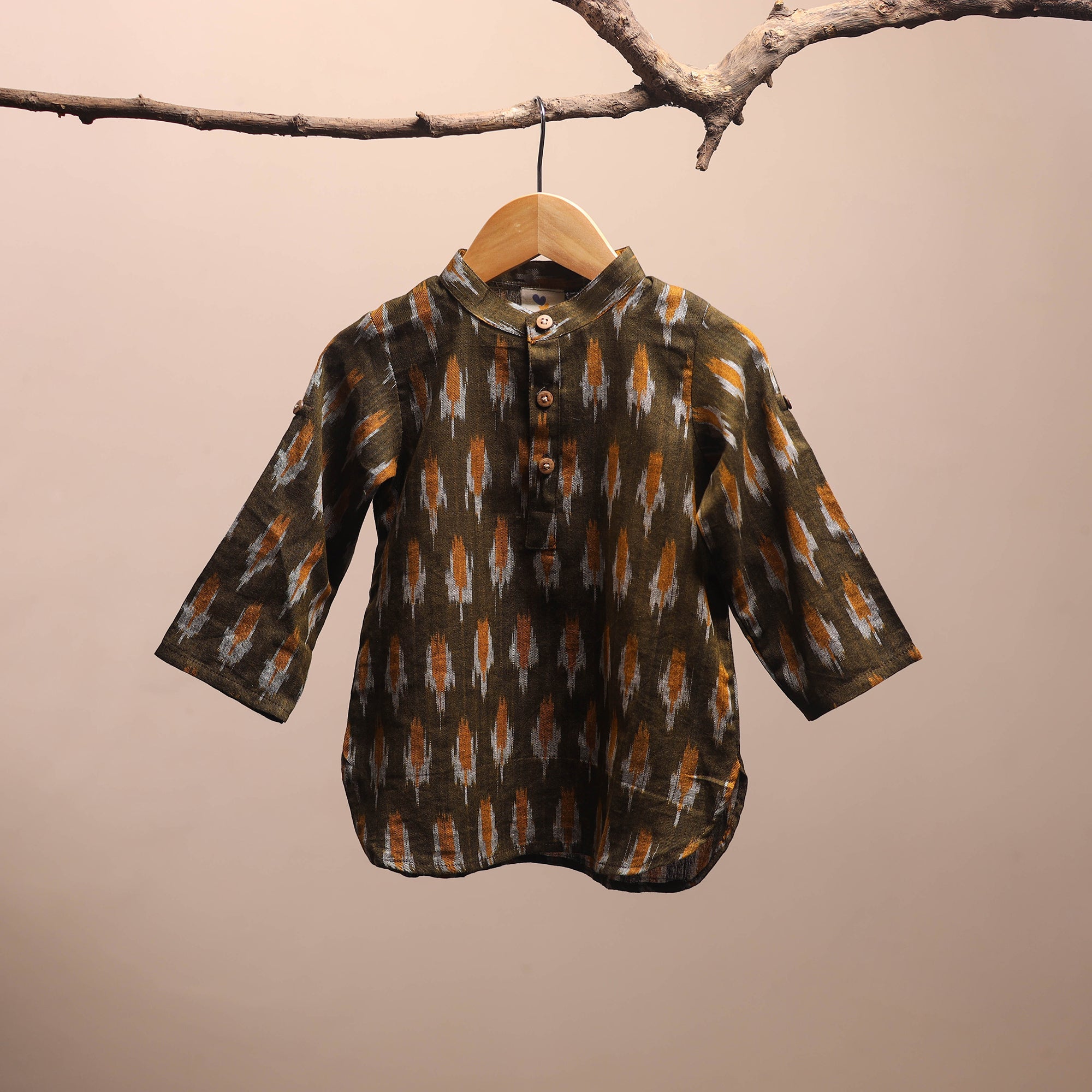 This green pochampally Ikat cotton kids' kurta is designed with timeless patterns and vibrant colors, perfect for everyday wear or festive occasions. Made using the traditional Ikat weaving technique from Telangana, it offers comfort with style. Pair it with pajamas or jeans for a versatile look that keeps your little one looking smart and feeling relaxed all day.