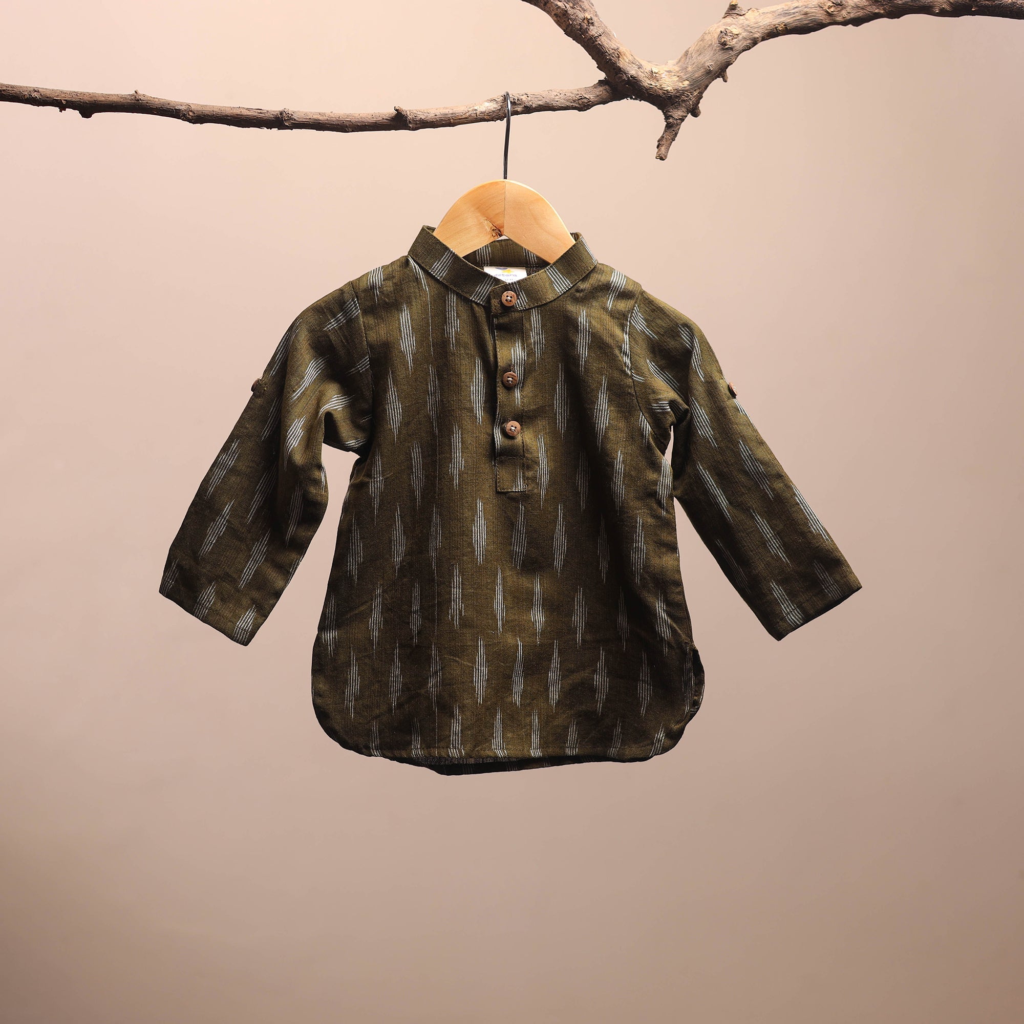 This green pochampally Ikat cotton kids' kurta is designed with timeless patterns and vibrant colors, perfect for everyday wear or festive occasions. Made using the traditional Ikat weaving technique from Telangana, it offers comfort with style. Pair it with pajamas or jeans for a versatile look that keeps your little one looking smart and feeling relaxed all day.