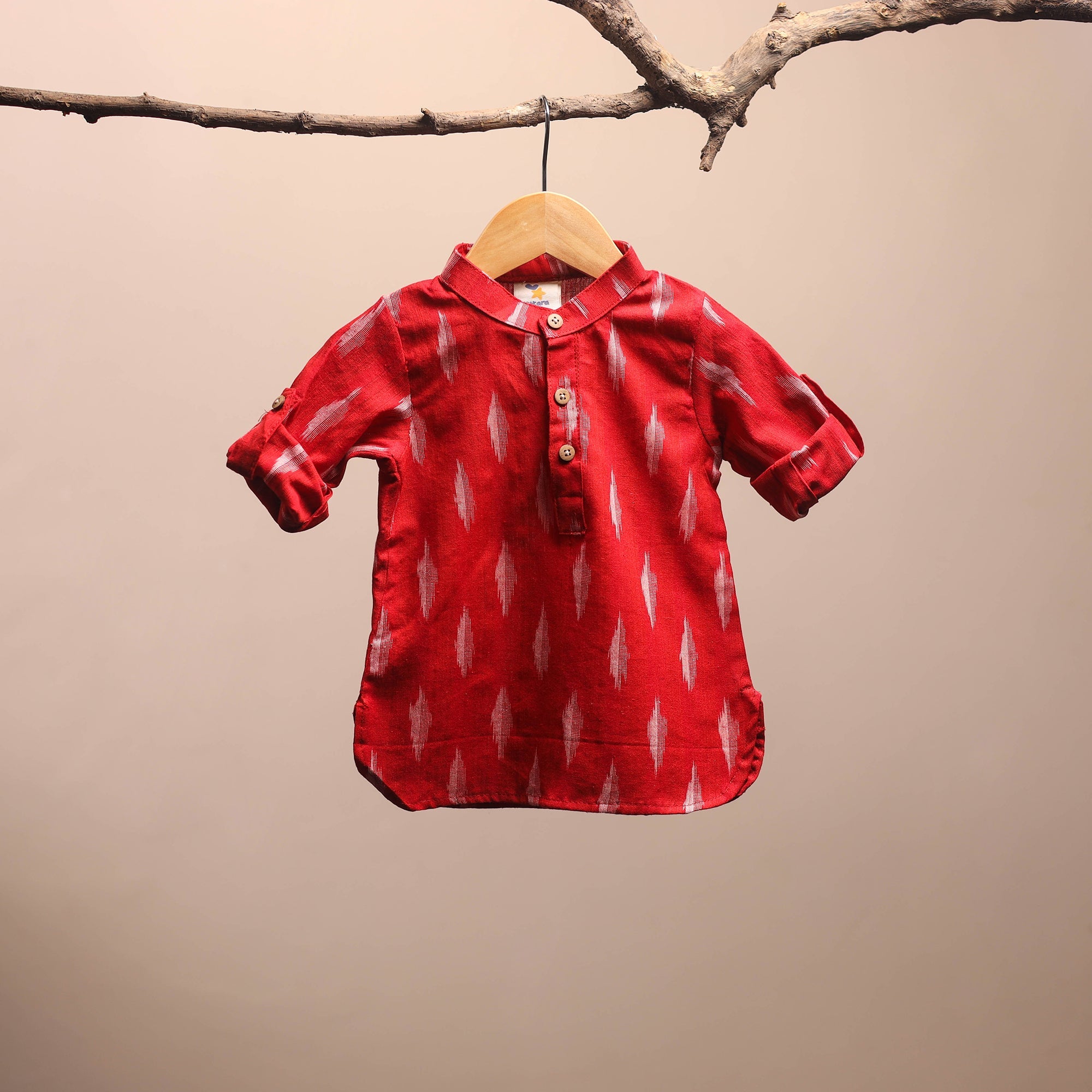 This red pochampally Ikat cotton kids' kurta is designed with timeless patterns and vibrant colors, perfect for everyday wear or festive occasions. Made using the traditional Ikat weaving technique from Telangana, it offers comfort with style. Pair it with pajamas or jeans for a versatile look that keeps your little one looking smart and feeling relaxed all day.