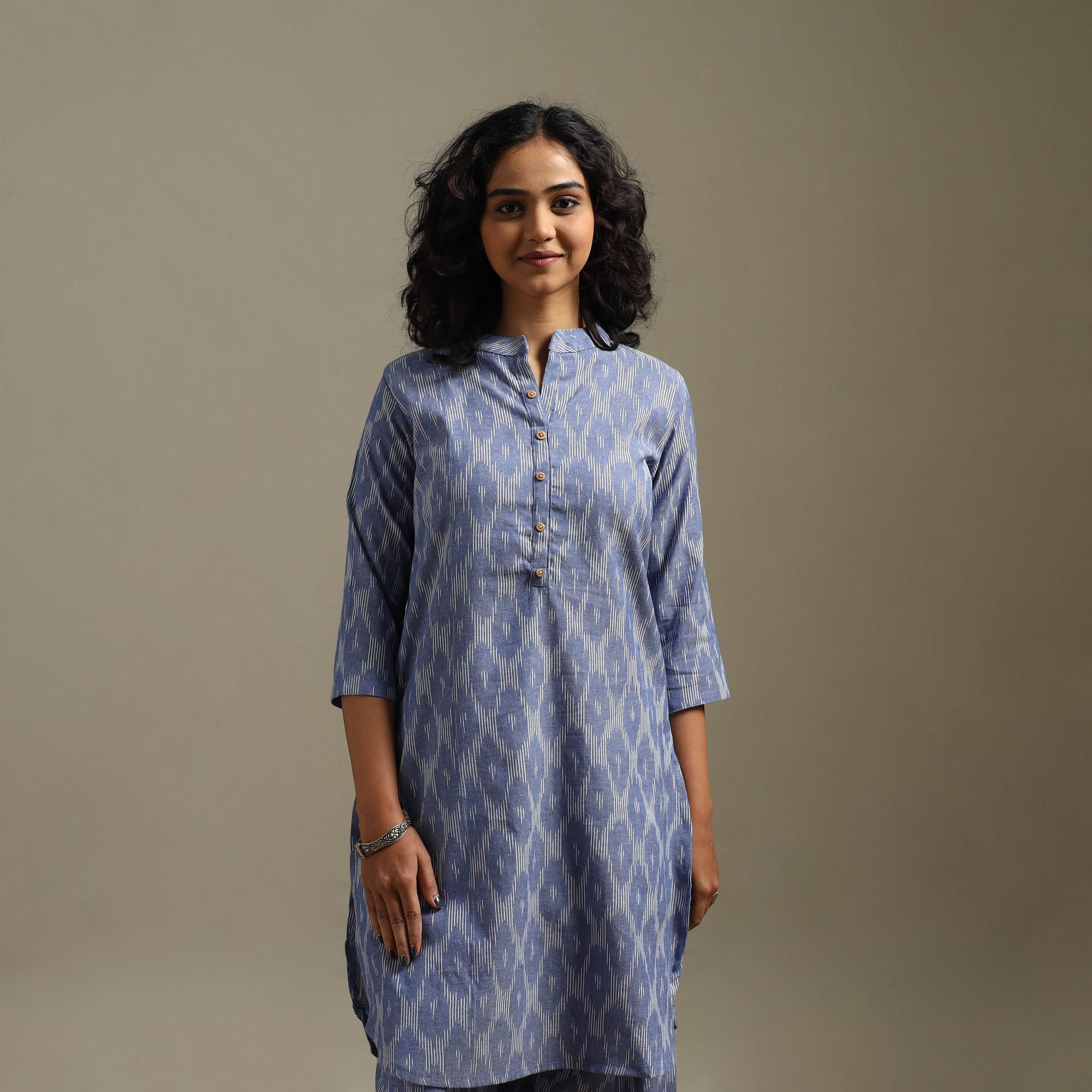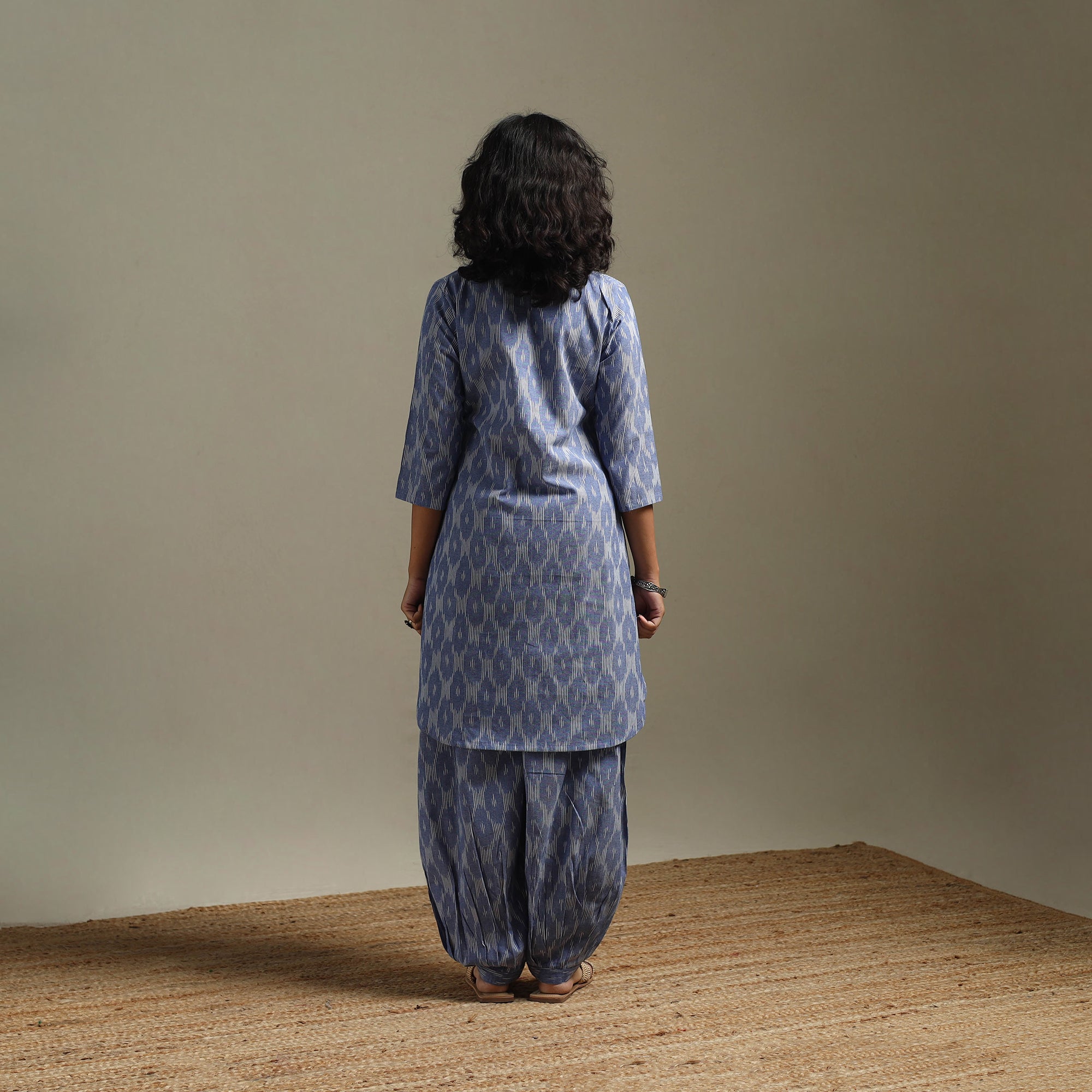 Pochampally ikat night suit set, made from breathable cotton blends comfort with artisanal charm. The ikat patterns are created by dyeing the yarns before weaving. It features relaxed-fit top and matching afghani salwar with elasticated waist and drawstring. Designed thoughtfully for cozy evenings and restful nights.