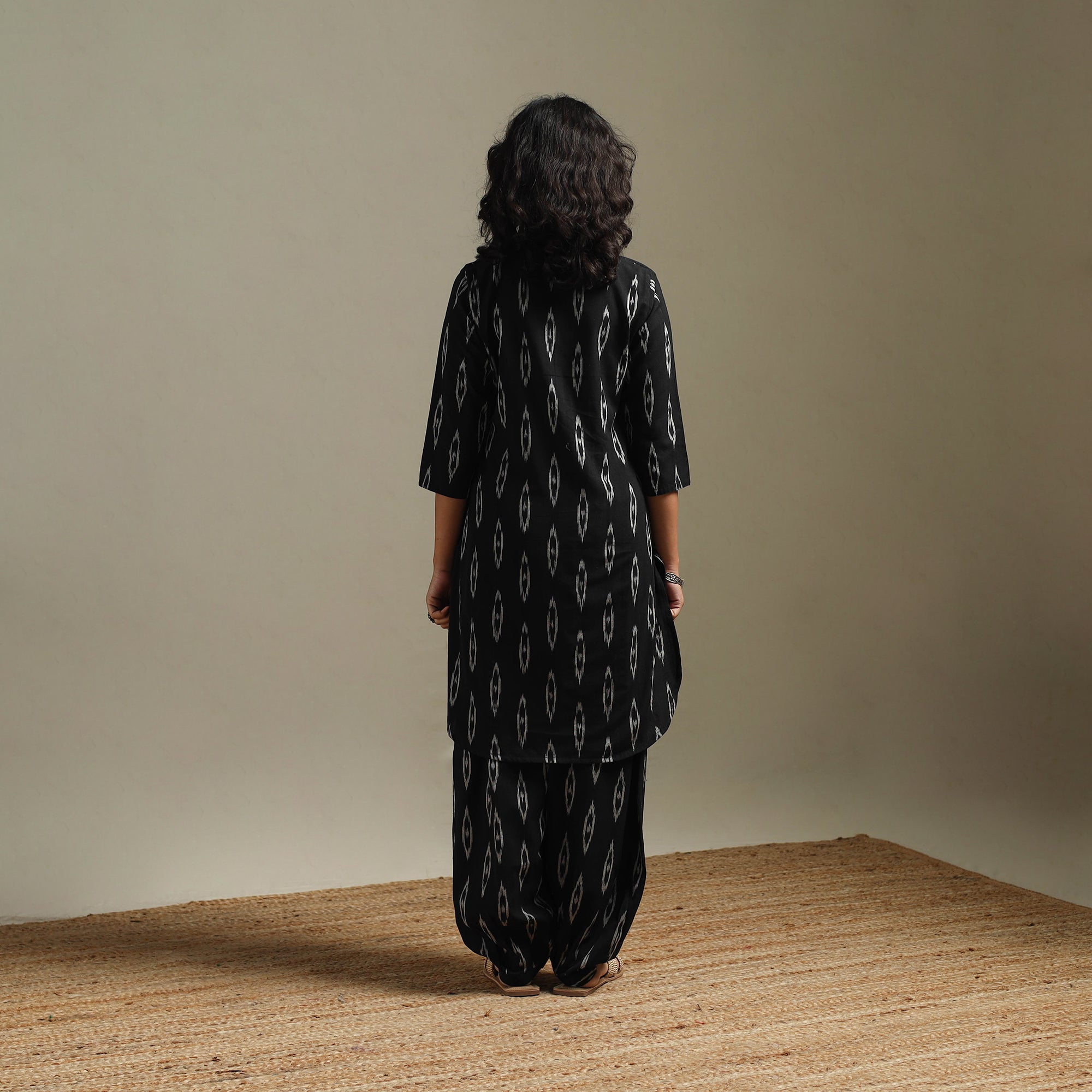 Pochampally ikat night suit set, made from breathable cotton blends comfort with artisanal charm. The ikat patterns are created by dyeing the yarns before weaving. It features relaxed-fit top and matching afghani salwar with elasticated waist and drawstring. Designed thoughtfully for cozy evenings and restful nights.