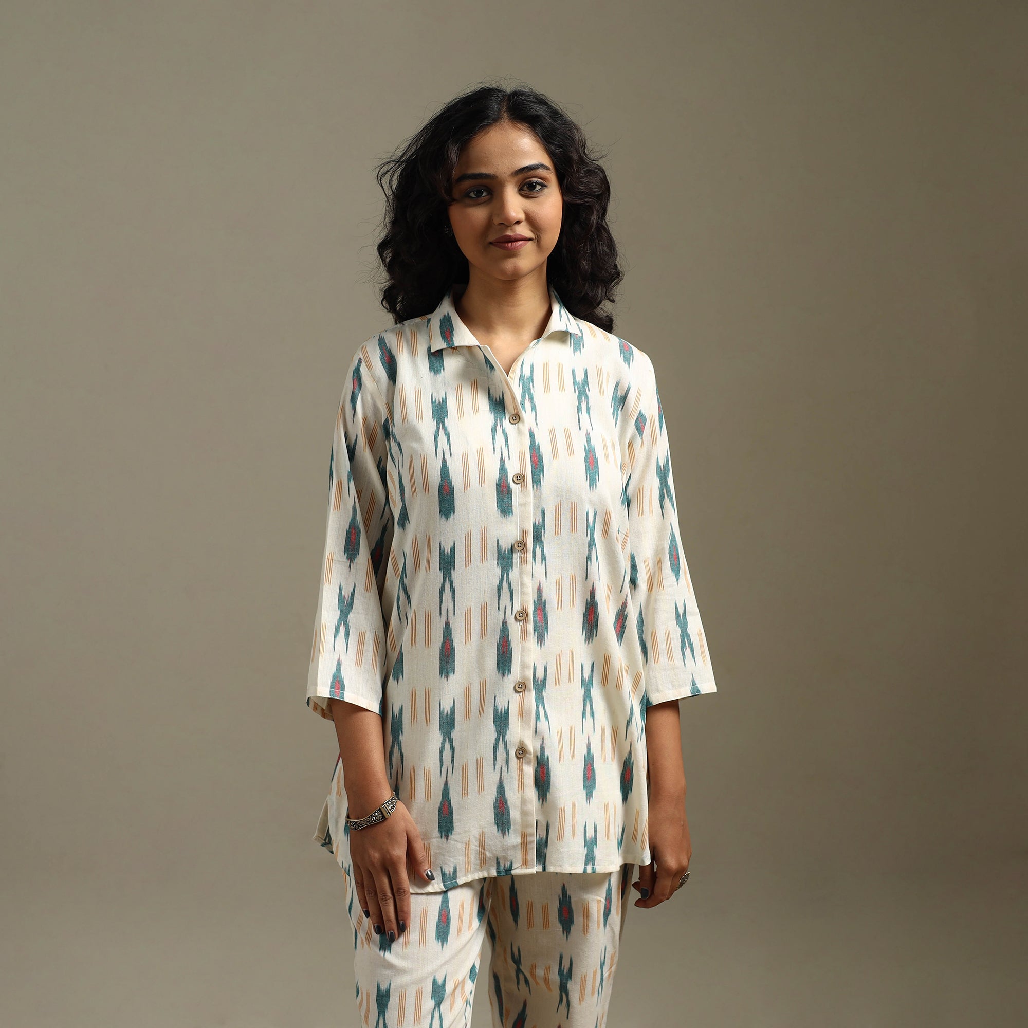 Pochampally ikat night suit set, made from breathable cotton, blends comfort with artisanal charm. The Ikat patterns are created by dyeing the yarns before weaving. It features front button placket top with and matching pant with elasticated waist and two side pockets. Designed thoughtfully for cozy evenings and restful nights.