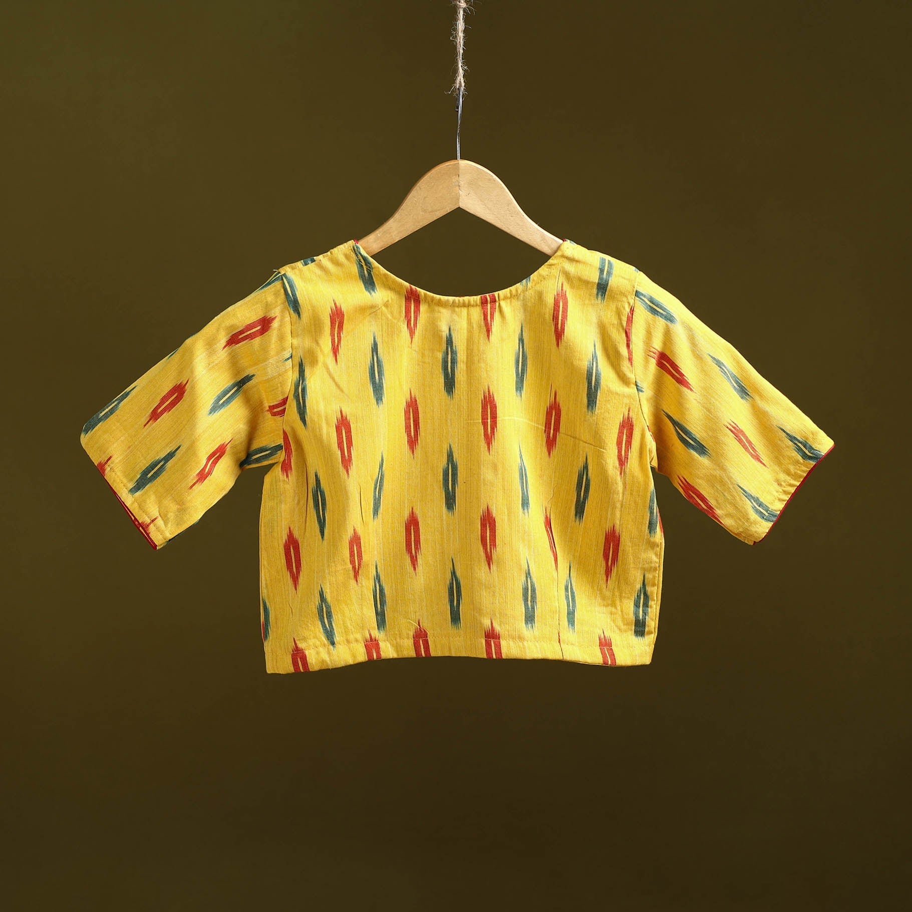 Yellow pochampally ikat cotton readymade blouse is woven using the traditional ikat method, where the threads are dyed before weaving to create the patterns on the fabric. The blouse comes with half sleeves and front wooden button lock that make it easy to wear, adds a graceful touch. Pairs beautifully with any of your favourite sarees.
