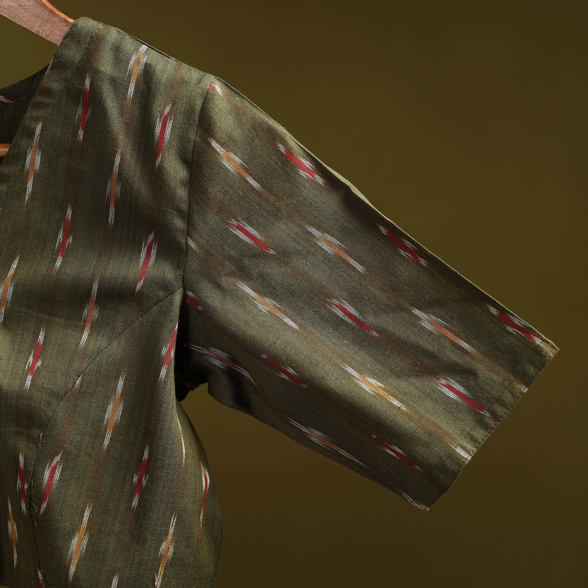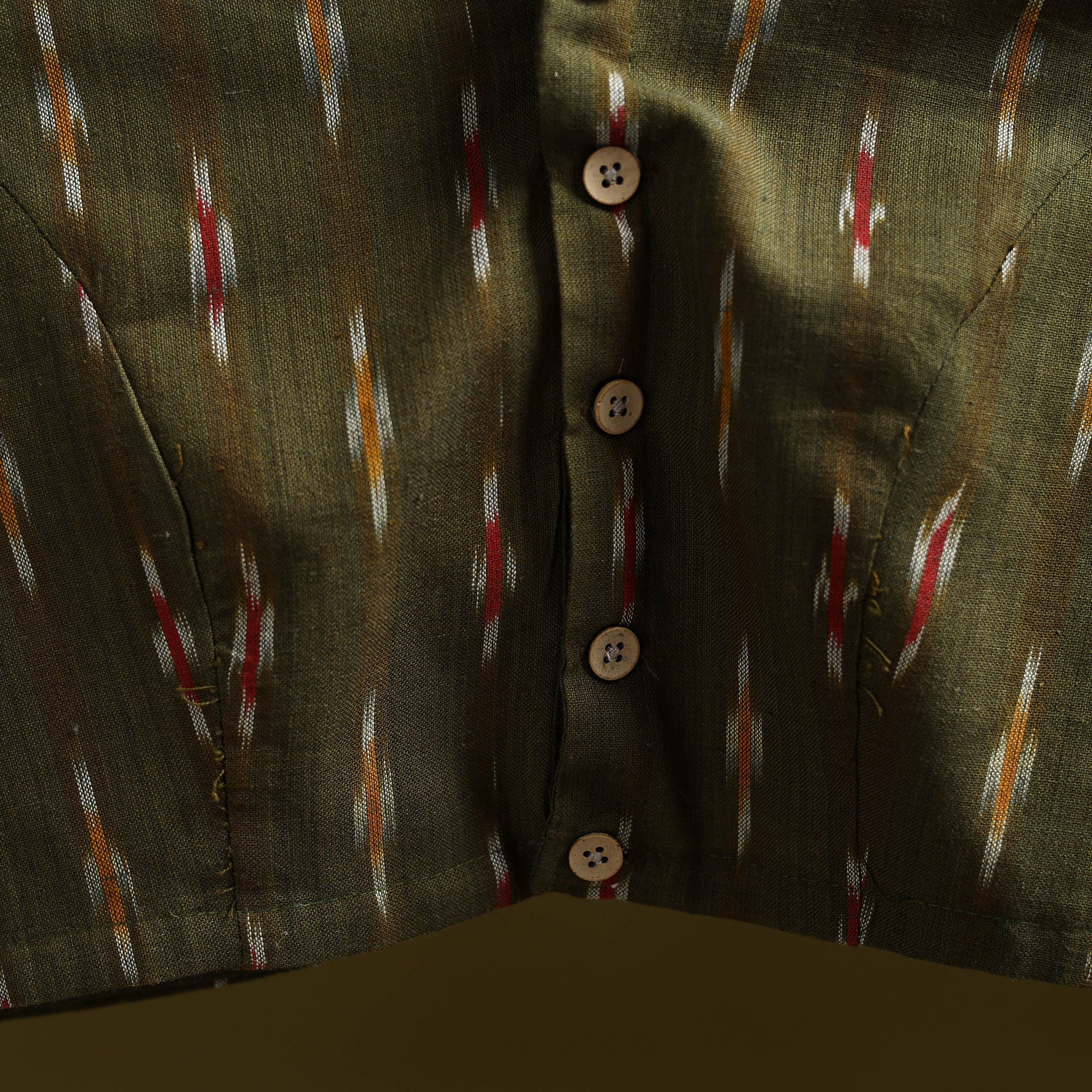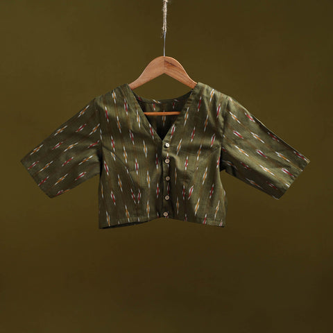 Green pochampally ikat cotton readymade blouse is woven using the traditional ikat method, where the threads are dyed before weaving to create the patterns on the fabric. The blouse comes with half sleeves and front wooden button lock that make it easy to wear, adds a graceful touch. Pairs beautifully with any of your favourite sarees.