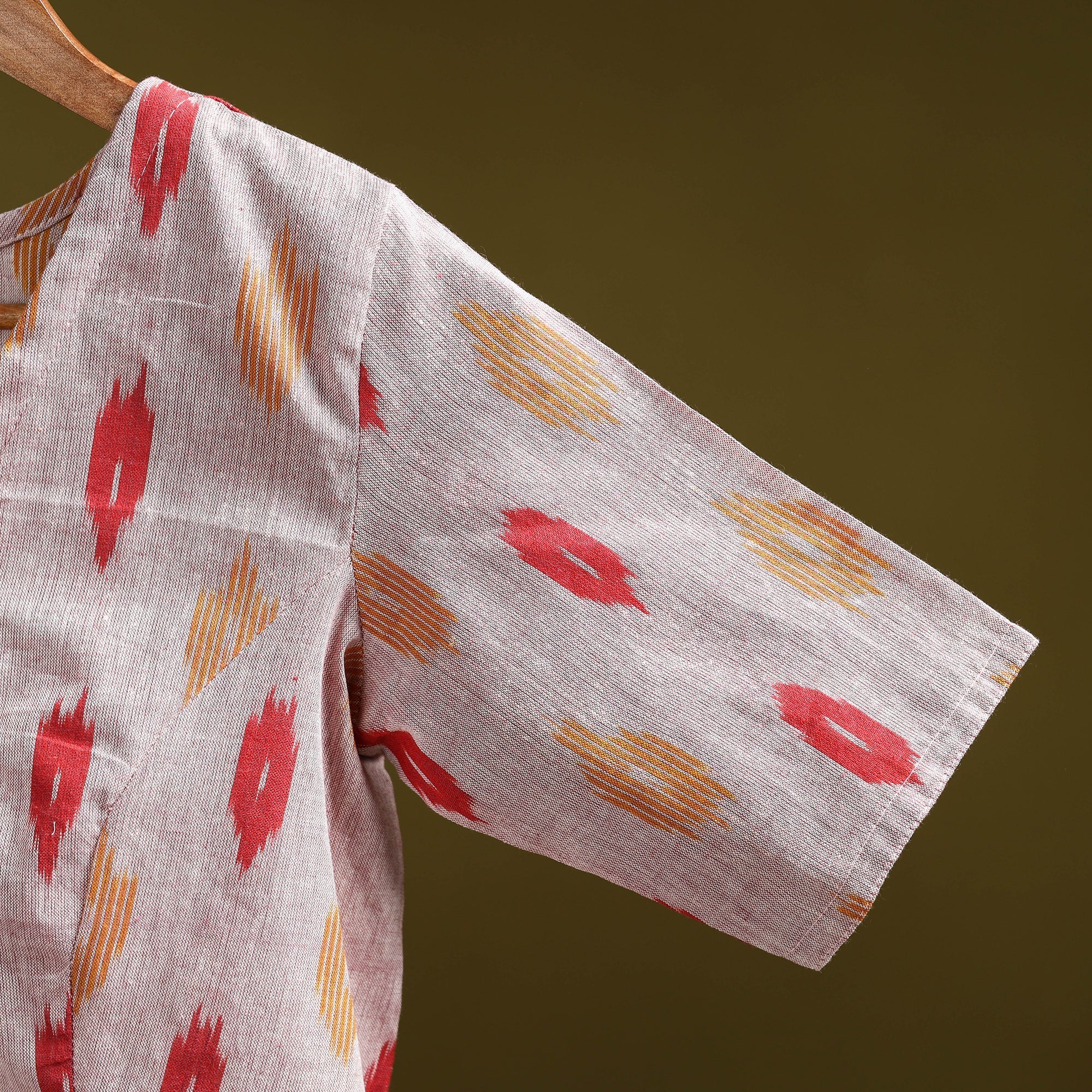 Pink pochampally ikat cotton readymade blouse is woven using the traditional ikat method, where the threads are dyed before weaving to create the patterns on the fabric. The blouse comes with half sleeves and front wooden button lock that make it easy to wear, adds a graceful touch. Pairs beautifully with any of your favourite sarees.