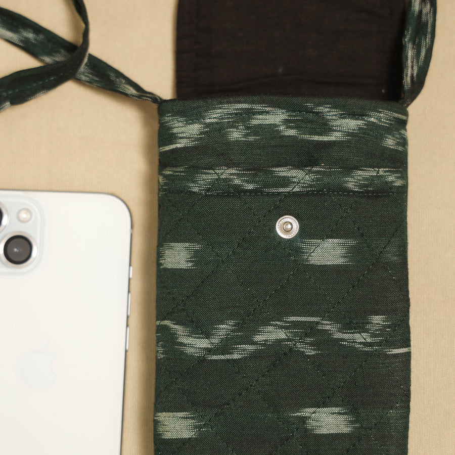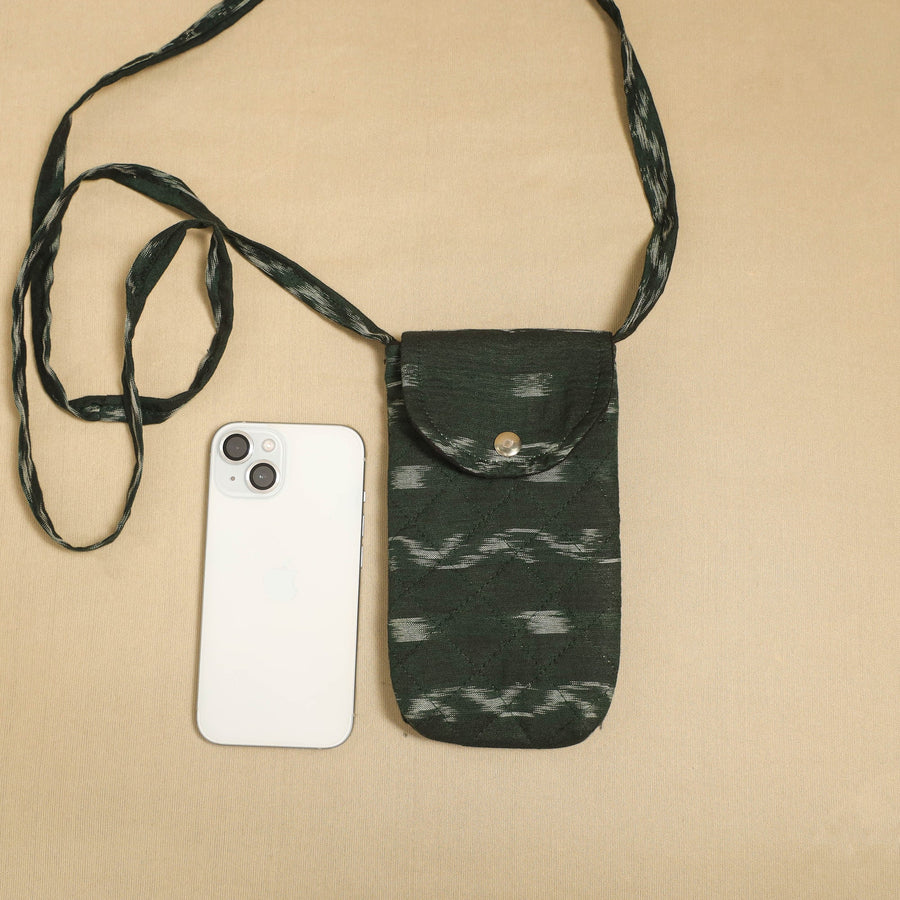 This green pochampally Ikat cotton sling mobile pouch beautifully blends timeless craftsmanship with everyday utility. Made from soft cotton, it's a little piece of art you can carry wherever you go. Thoughtfully designed with two spacious pockets, it keeps your phone and small essentials neatly organised. The convenient sling dori makes it perfect for on-the-go plans.