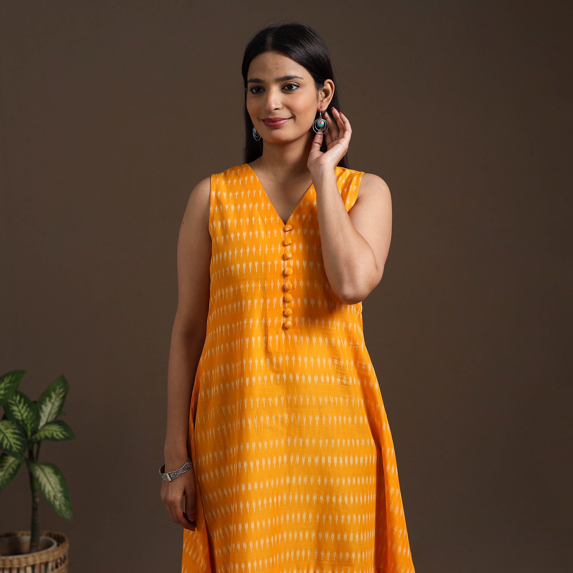 This orange pochampally Ikat cotton tiered dress beautifully blends traditional weaving with modern comfort. Crafted using the Ikat dyeing technique, it showcases distinctive, pre-dyed woven patterns on soft cotton fabric. The layered flare gives it a graceful silhouette, while the sleeveless design keeps it light and breathable. Ideal for casual outings, travel, or anytime you want effortless style with cultural charm.
