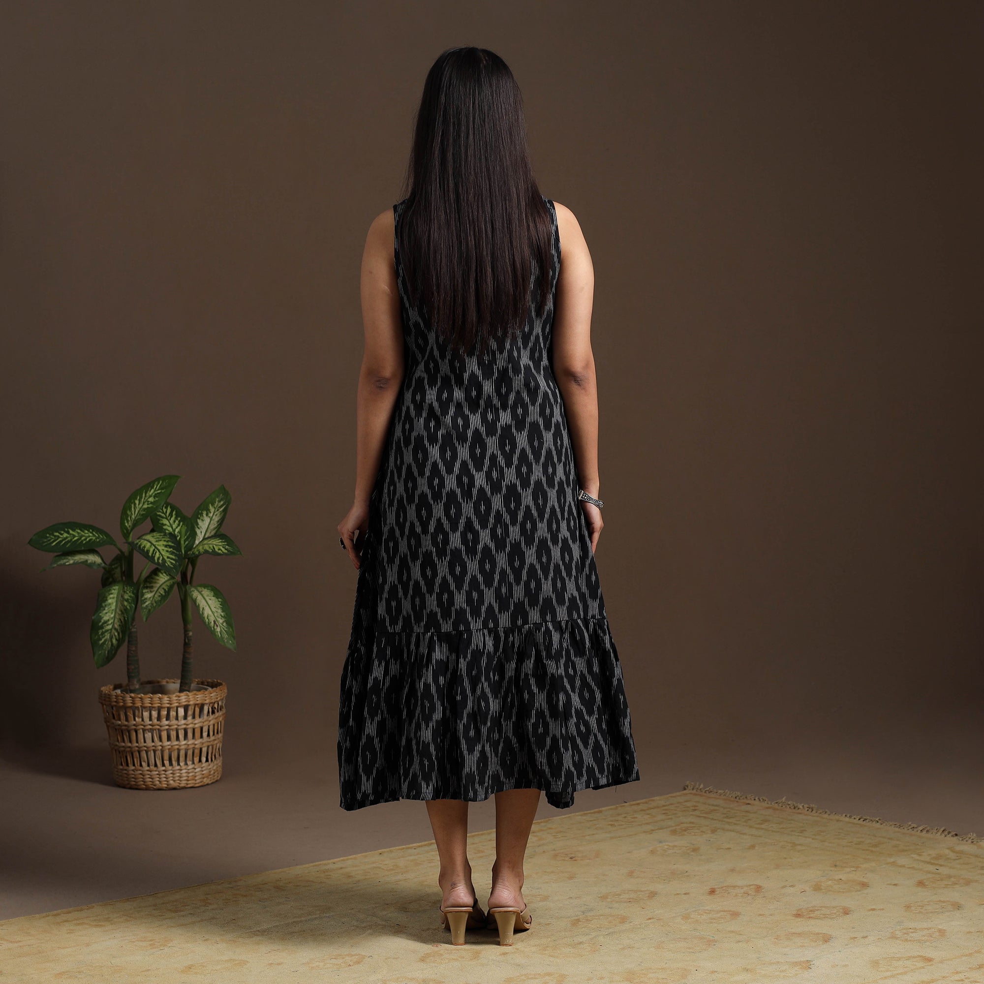 This black pochampally Ikat cotton tiered dress beautifully blends traditional weaving with modern comfort. Crafted using the Ikat dyeing technique, it showcases distinctive, pre-dyed woven patterns on soft cotton fabric. The layered flare gives it a graceful silhouette, while the sleeveless design keeps it light and breathable. Ideal for casual outings, travel, or anytime you want effortless style with cultural charm.