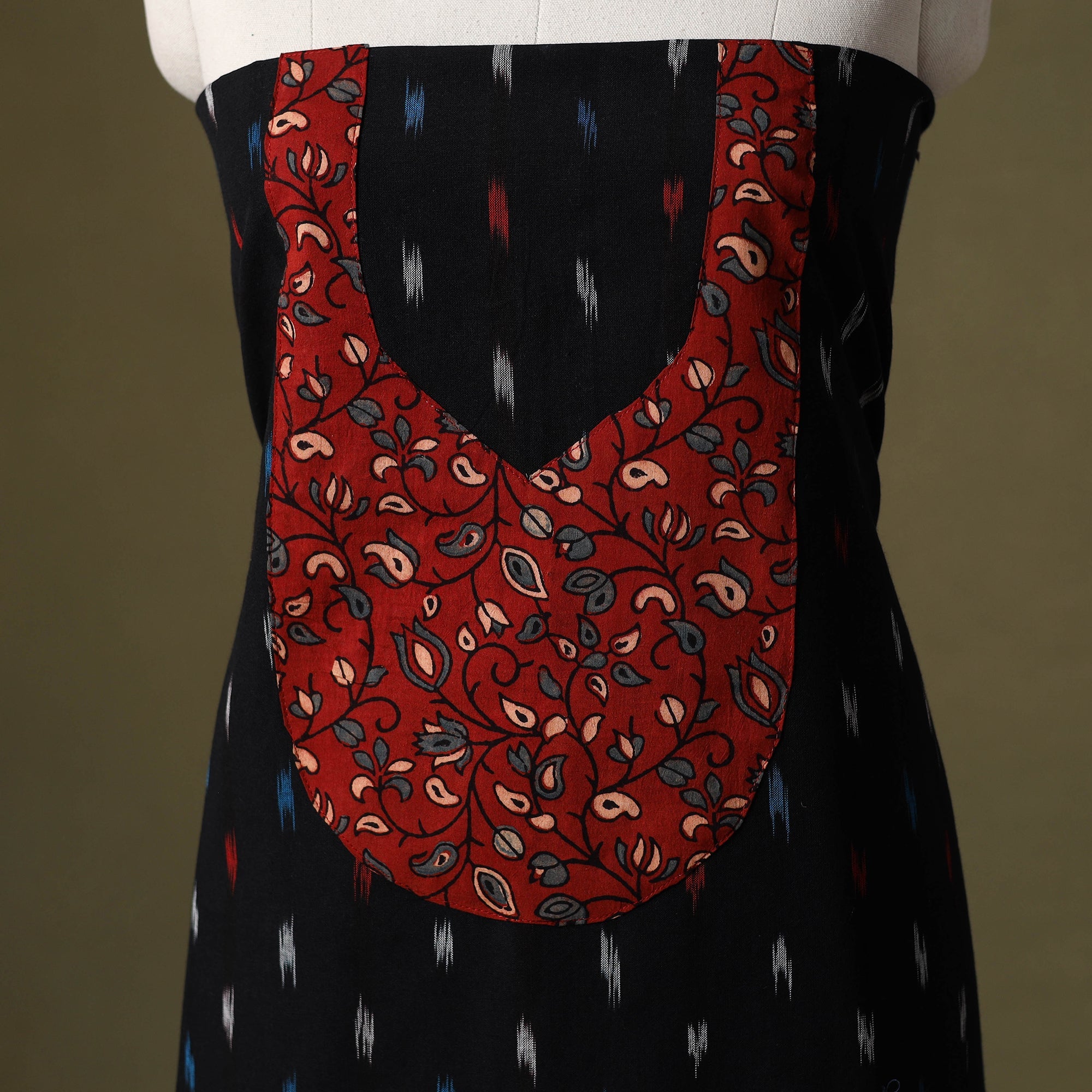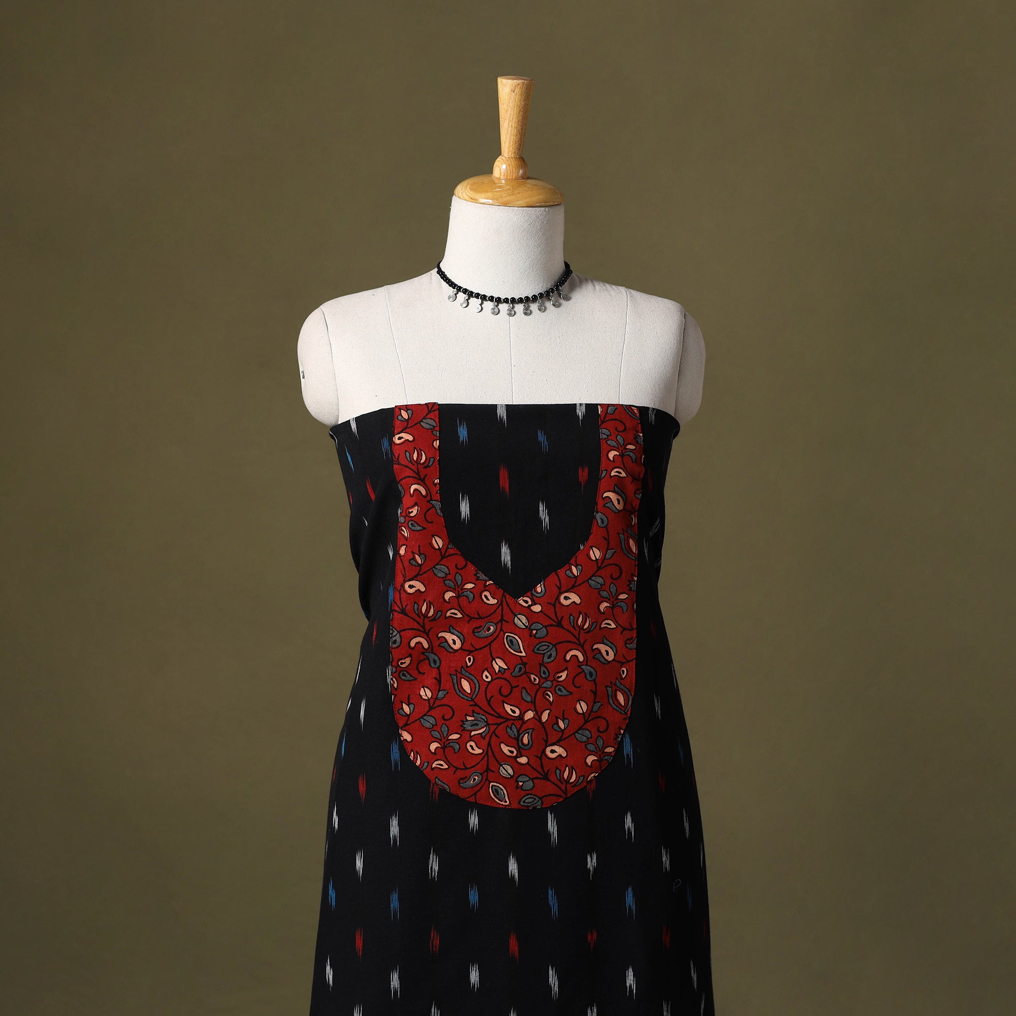 This black pochampally Ikat cotton kurta material is soft, breathable, and perfect for everyday wear. It features a handcrafted patchwork design on the front neckline, adding a subtle touch of uniqueness. Ideal for creating comfortable daily kurtas, office-wear styles, or casual outfits. Just pick your style and get it stitched your way.