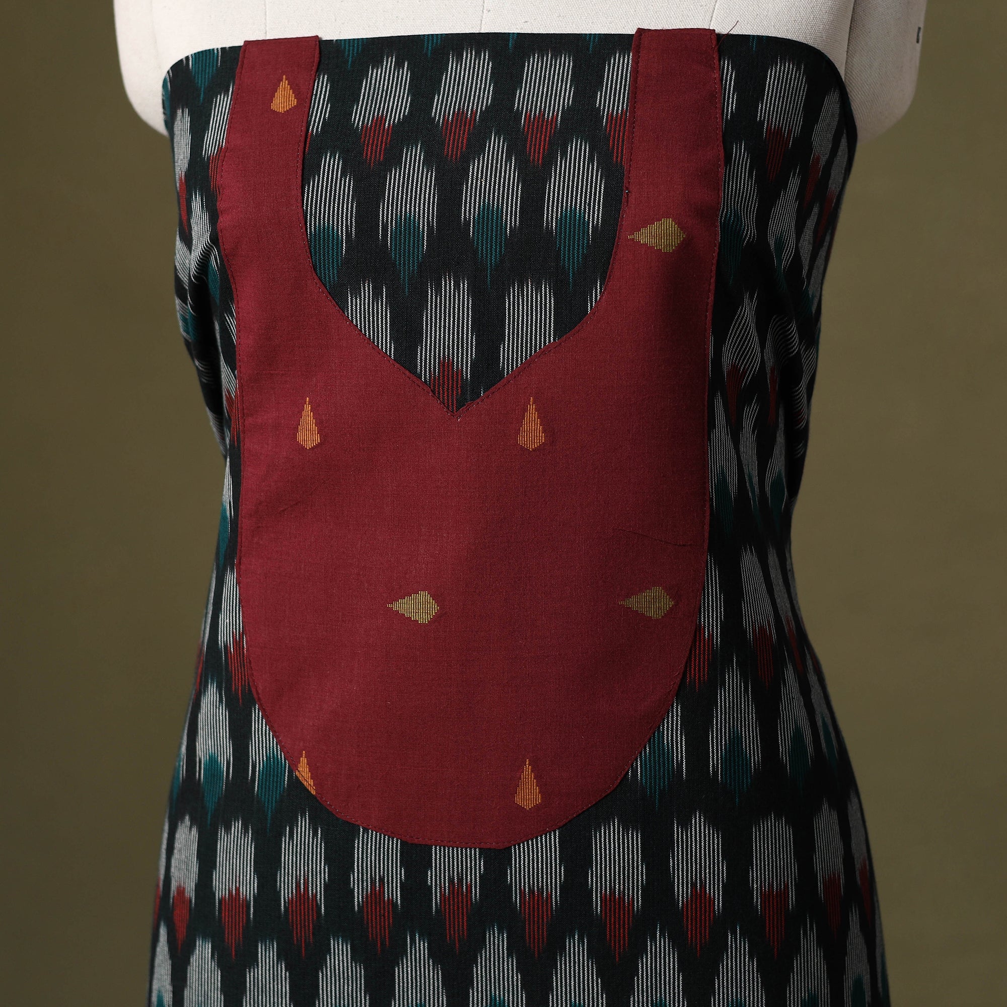 This black pochampally Ikat cotton kurta material is soft, breathable, and perfect for everyday wear. It features a handcrafted patchwork design on the front neckline, adding a subtle touch of uniqueness. Ideal for creating comfortable daily kurtas, office-wear styles, or casual outfits. Just pick your style and get it stitched your way.