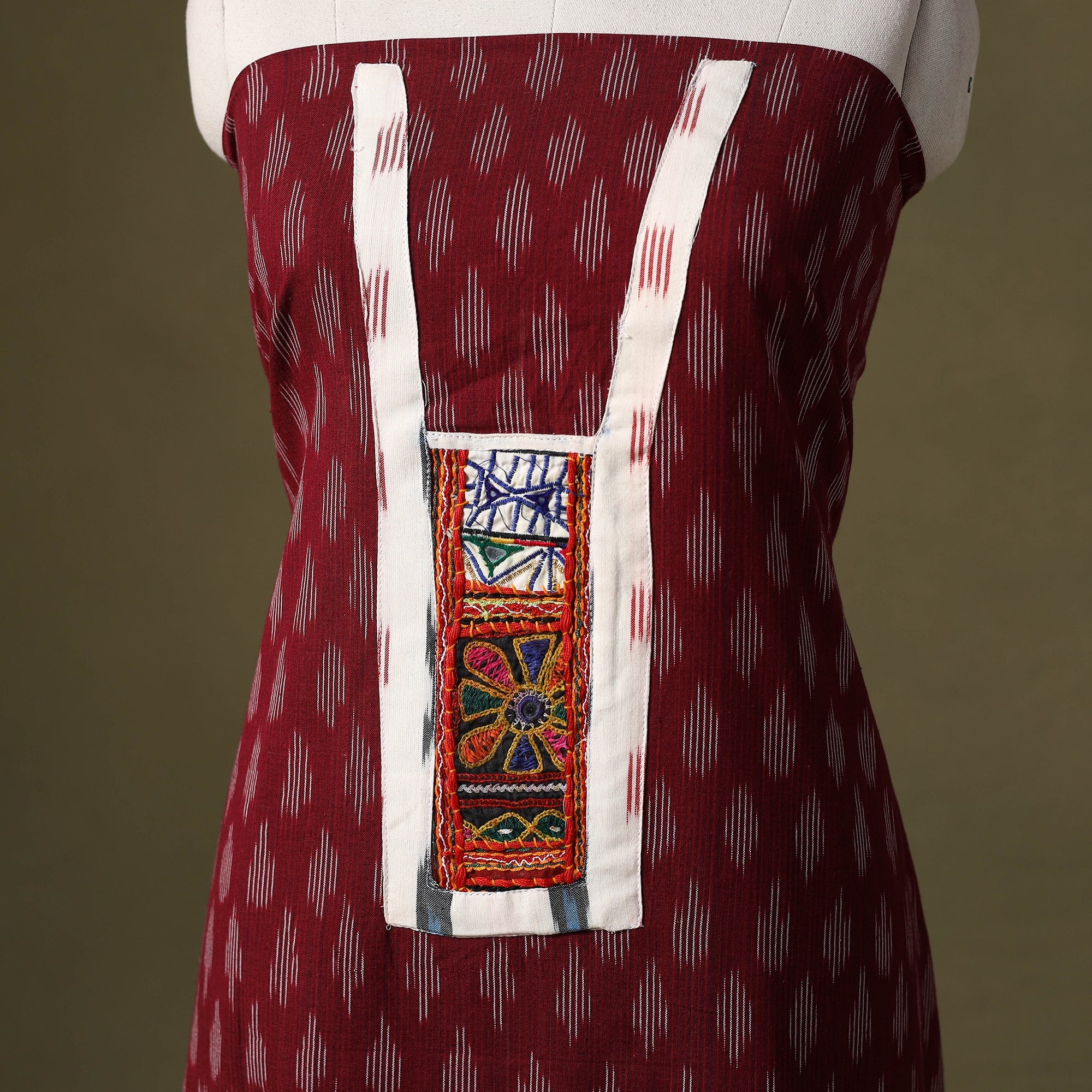 This maroon pochampally Ikat cotton kurta material is soft, breathable, and perfect for everyday wear. It features a handcrafted patchwork design on the front neckline, adding a subtle touch of uniqueness. Ideal for creating comfortable daily kurtas, office-wear styles, or casual outfits. Just pick your style and get it stitched your way.