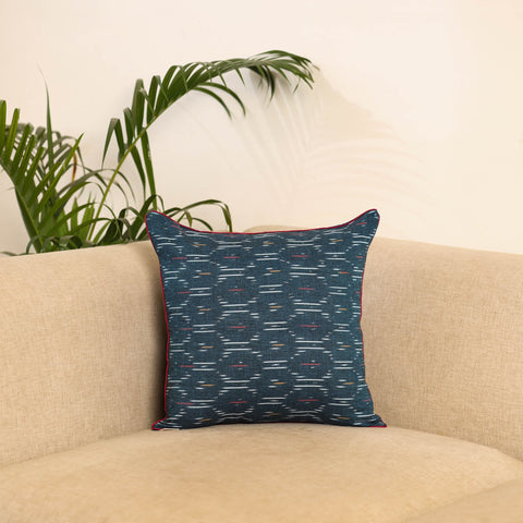 | Material | Blue pochampally ikat weave cushion cover, crafted from cotton and traditional Indian handmade textiles. It blends artistry with comfort, making it perfect for your sofa, bed or lounge area. |