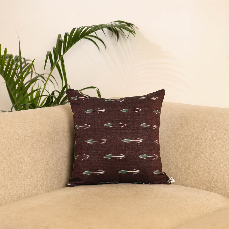 Brown pochampally ikat weave cushion cover, crafted from cotton and traditional Indian handmade textiles. It blends artistry with comfort, making it perfect for your sofa, bed or lounge area.