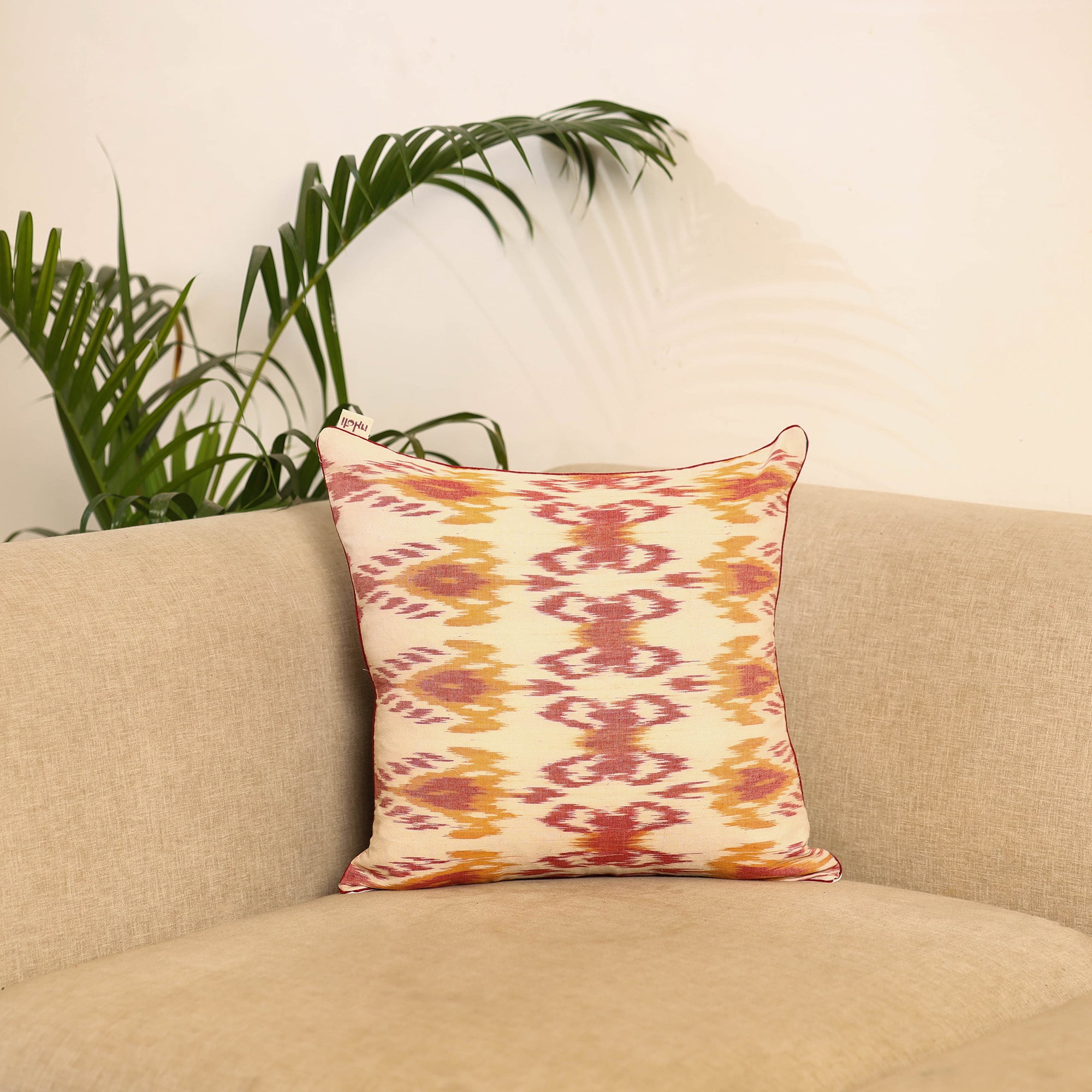 White pochampally ikat weave cushion cover, crafted from cotton and traditional Indian handmade textiles. It blends artistry with comfort, making it perfect for your sofa, bed or lounge area.
