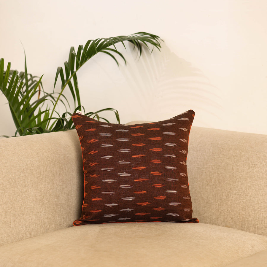 Brown pochampally ikat weave cushion cover, crafted from cotton and traditional Indian handmade textiles. It blends artistry with comfort, making it perfect for your sofa, bed or lounge area.