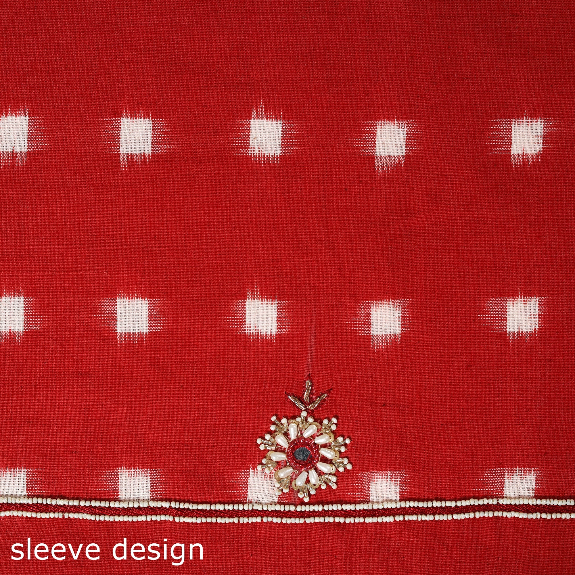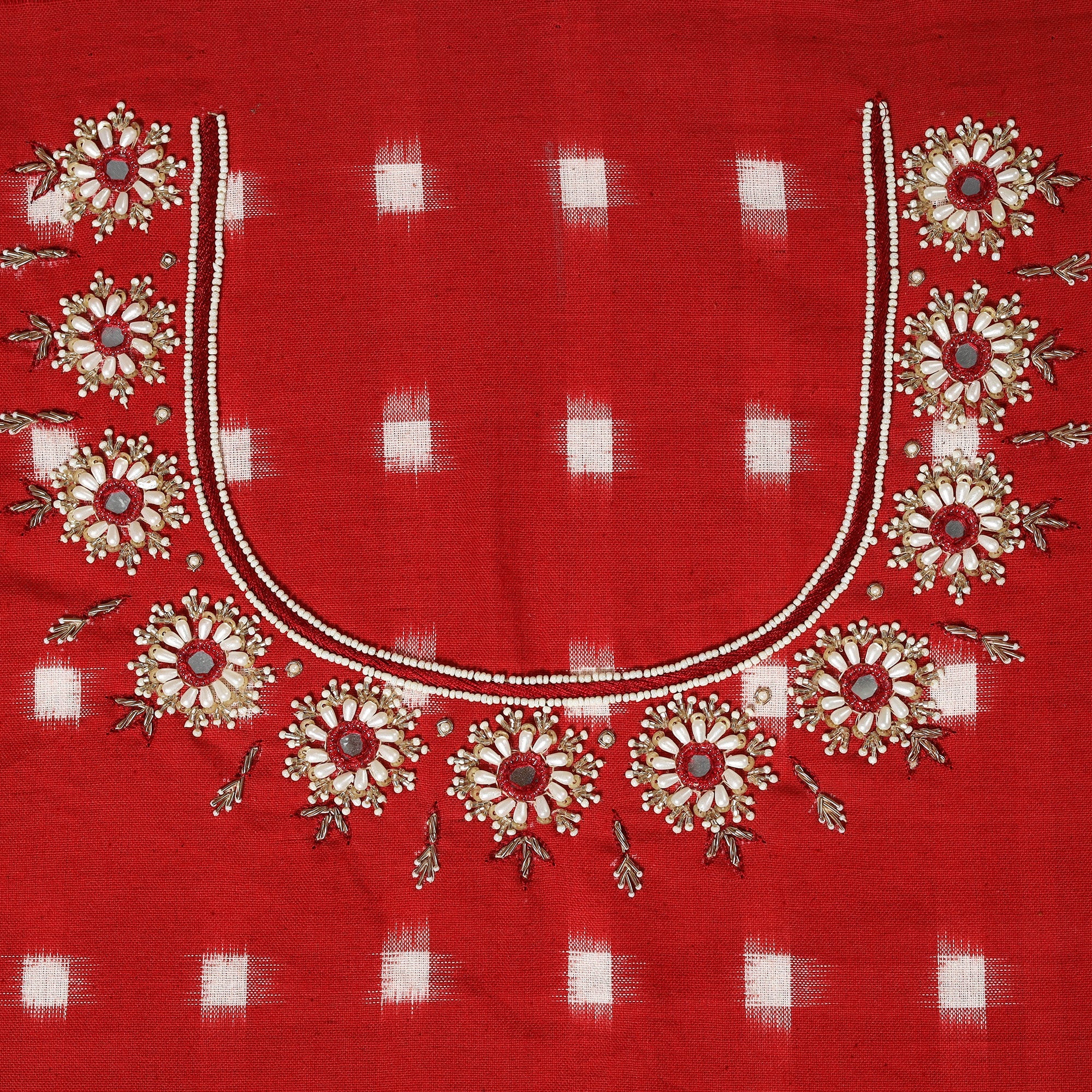 This handcrafted red blouse piece features intricate hand embroidery on pochampally ikat cotton fabric, offering a blend of traditional art and everyday comfort. Ideal for pairing with sarees, it can be used to create stylish blouses for casual wear, or festive occasions.