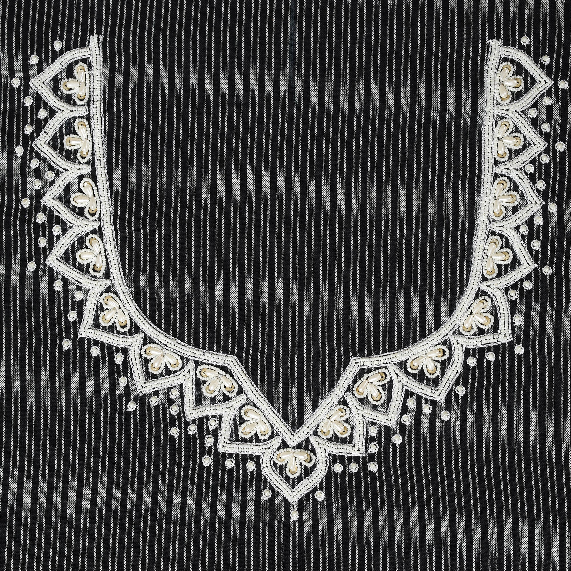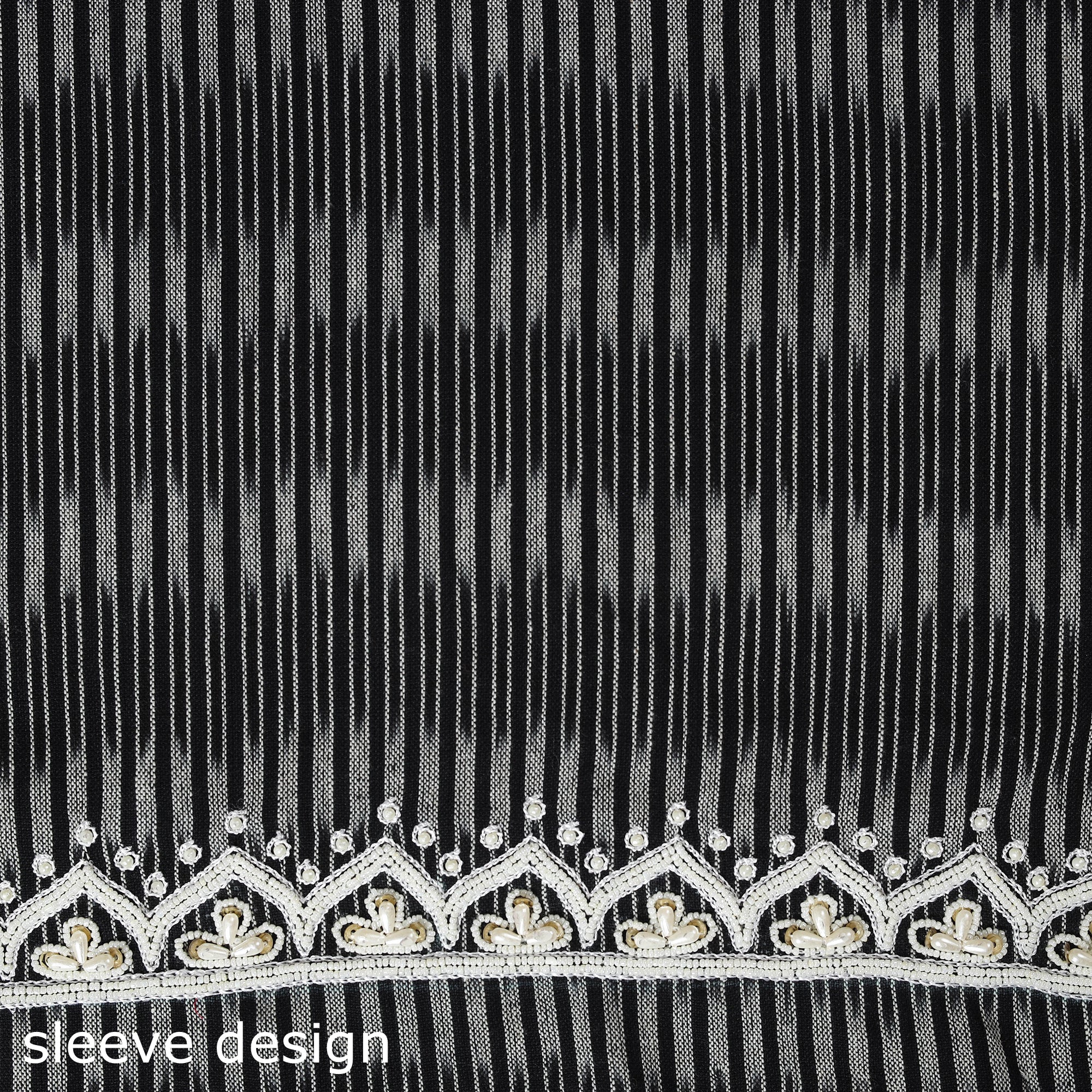 This handcrafted black blouse piece features intricate hand embroidery on pochampally ikat cotton fabric, offering a blend of traditional art and everyday comfort. Ideal for pairing with sarees, it can be used to create stylish blouses for casual wear, or festive occasions.