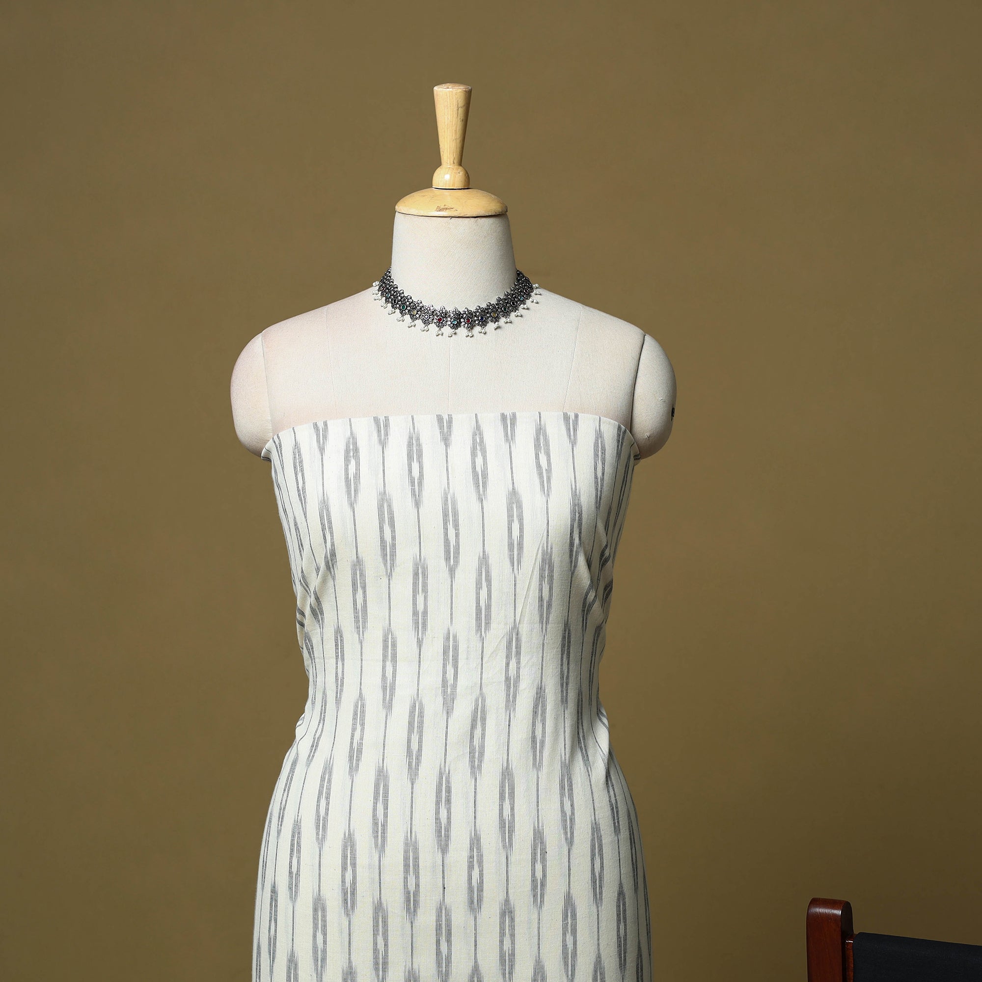 White pochampally ikat handloom 3pc unstitched dress material is made from cotton and crafted using the ikat technique, where the warp and weft threads are dyed before weaving. Artisans then arrange the dyed threads on the loom in a set sequence, allowing the pattern to form naturally as the fabric is woven. The set includes kurta fabric, a double ikat dupatta and a plain bottom. Rooted in a centuries-old weaving tradition, it’s a distinctive choice for festive occasions, weddings and refined everyday wear.