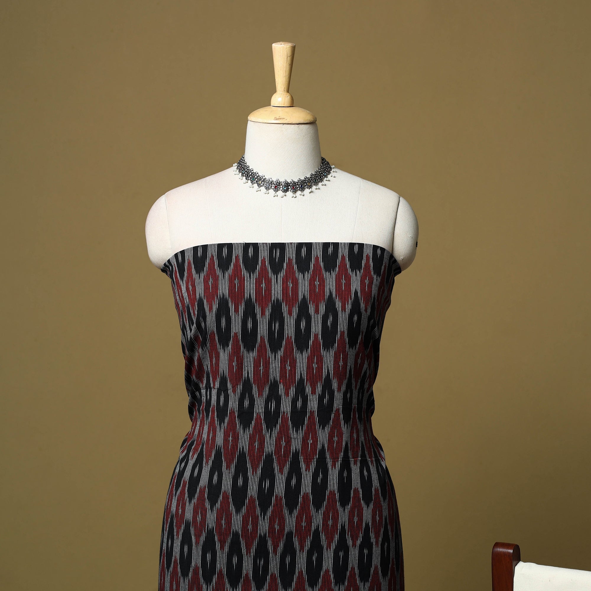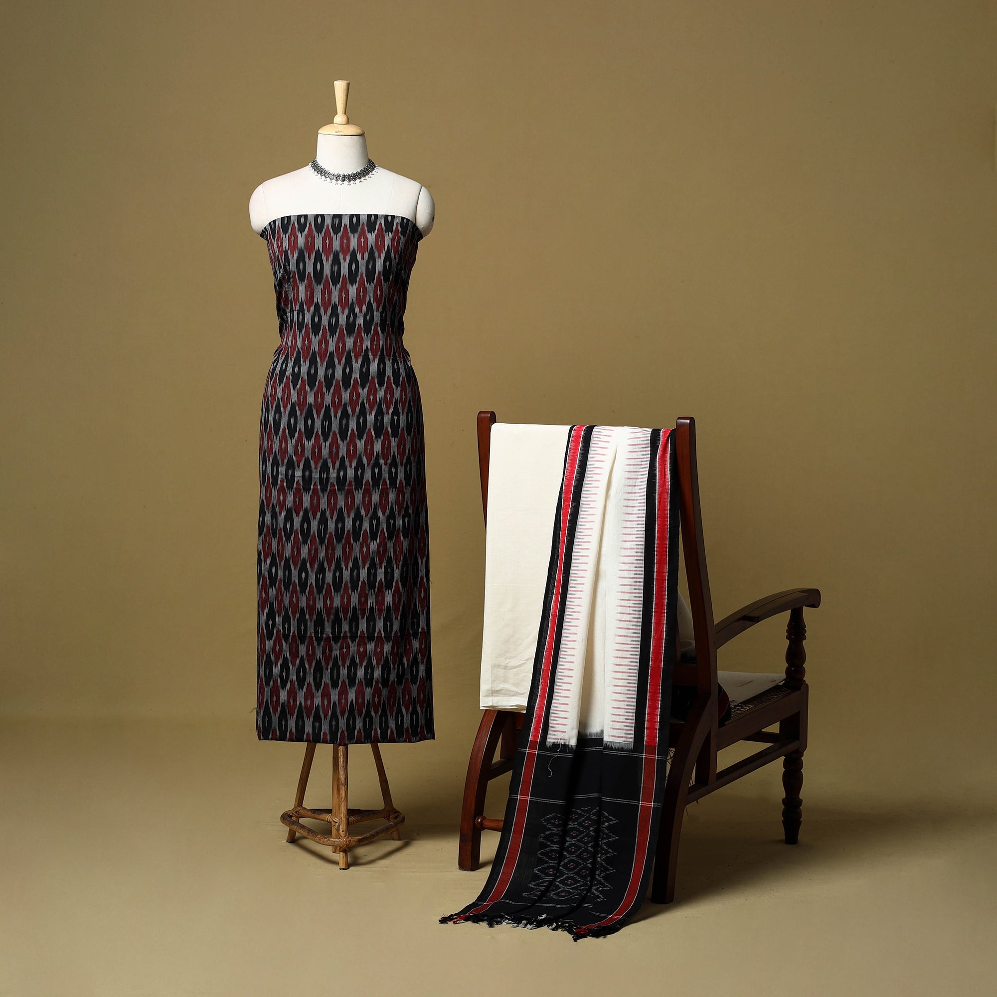 Black pochampally ikat handloom 3pc unstitched dress material is made from cotton and crafted using the ikat technique, where the warp and weft threads are dyed before weaving. Artisans then arrange the dyed threads on the loom in a set sequence, allowing the pattern to form naturally as the fabric is woven. The set includes kurta fabric, a double ikat dupatta and a plain bottom. Rooted in a centuries-old weaving tradition, it’s a distinctive choice for festive occasions, weddings and refined everyday wear.