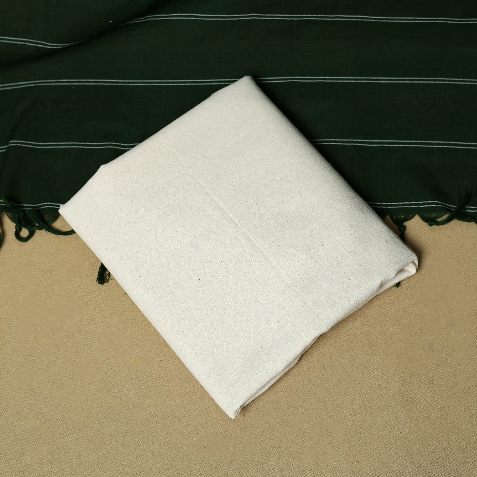 White pochampally ikat handloom 3pc unstitched dress material is made from cotton and crafted using the ikat technique, where the warp and weft threads are dyed before weaving. Artisans then arrange the dyed threads on the loom in a set sequence, allowing the pattern to form naturally as the fabric is woven. The set includes kurta fabric, a double ikat dupatta and a plain bottom. Rooted in a centuries-old weaving tradition, it’s a distinctive choice for festive occasions, weddings and refined everyday wear.