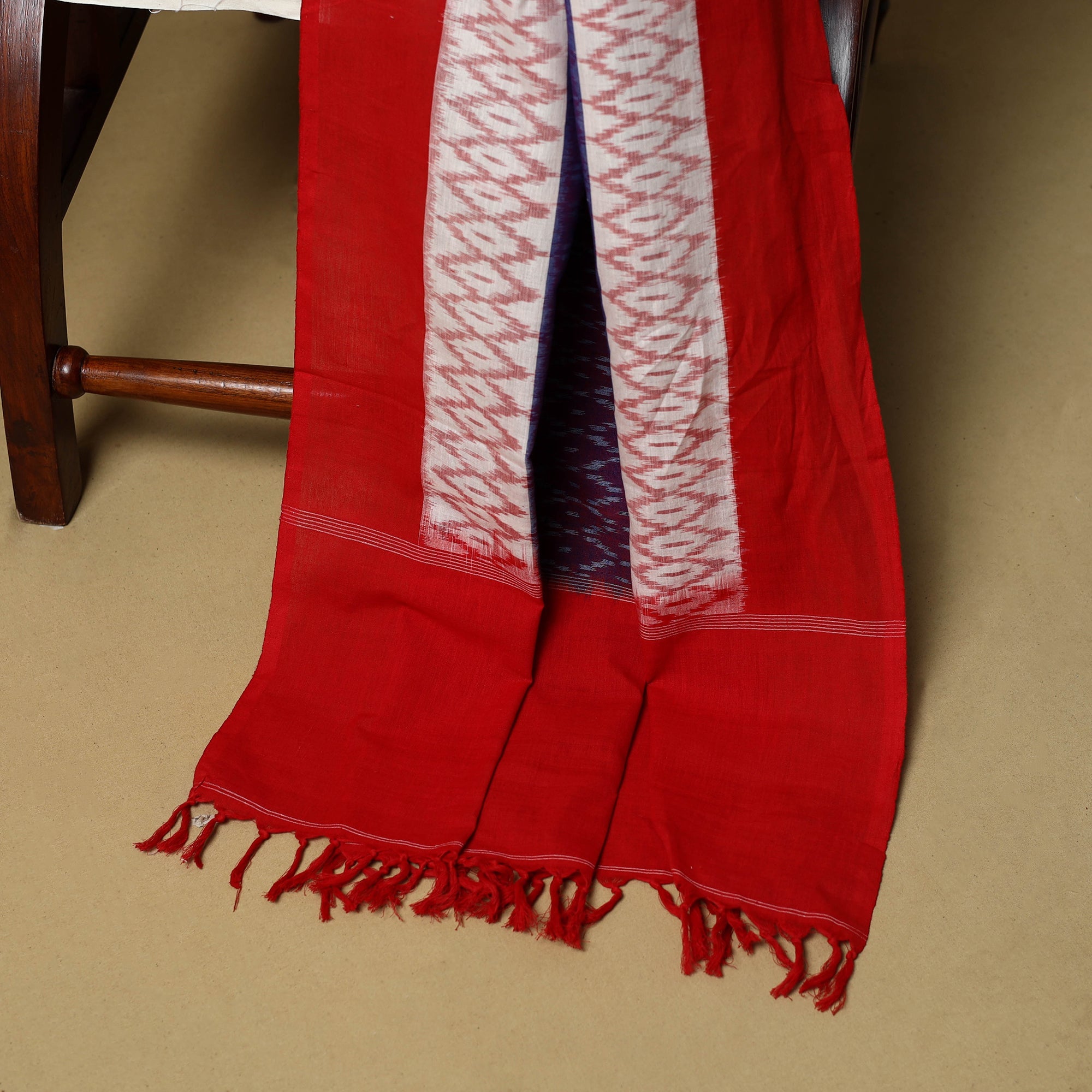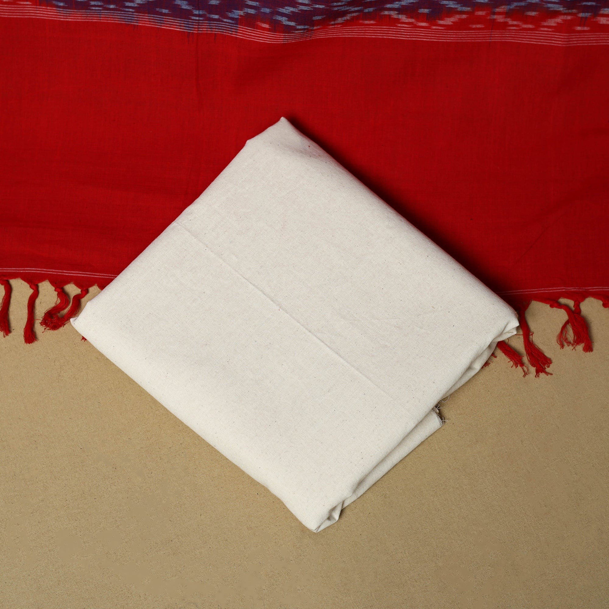 Red pochampally ikat handloom 3pc unstitched dress material is made from cotton and crafted using the ikat technique, where the warp and weft threads are dyed before weaving. Artisans then arrange the dyed threads on the loom in a set sequence, allowing the pattern to form naturally as the fabric is woven. The set includes kurta fabric, a double ikat dupatta and a plain bottom. Rooted in a centuries-old weaving tradition, it’s a distinctive choice for festive occasions, weddings and refined everyday wear.