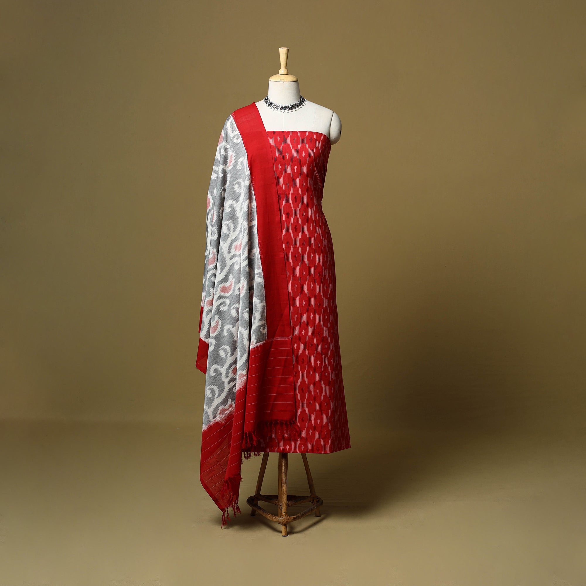Red pochampally ikat handloom 3pc unstitched dress material is made from cotton and crafted using the ikat technique, where the warp and weft threads are dyed before weaving. Artisans then arrange the dyed threads on the loom in a set sequence, allowing the pattern to form naturally as the fabric is woven. The set includes kurta fabric, a double ikat dupatta and a plain bottom. Rooted in a centuries-old weaving tradition, it’s a distinctive choice for festive occasions, weddings and refined everyday wear.