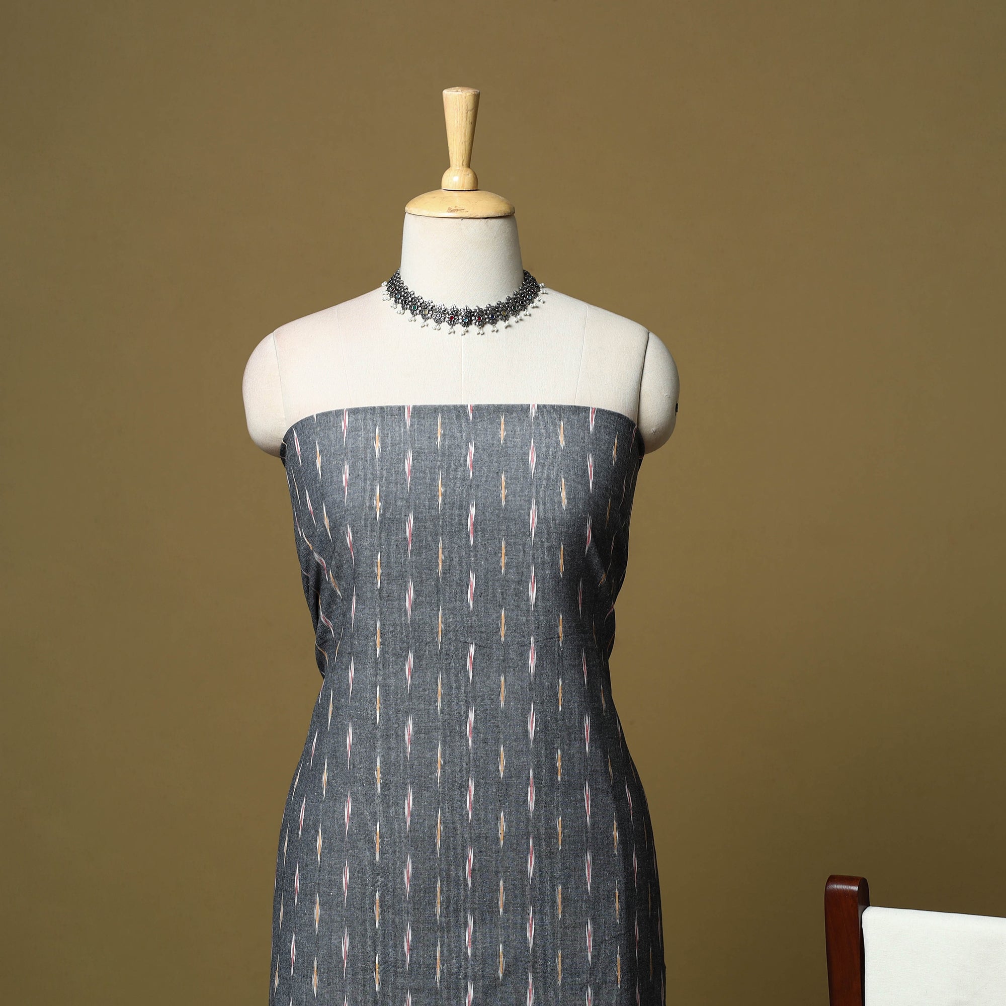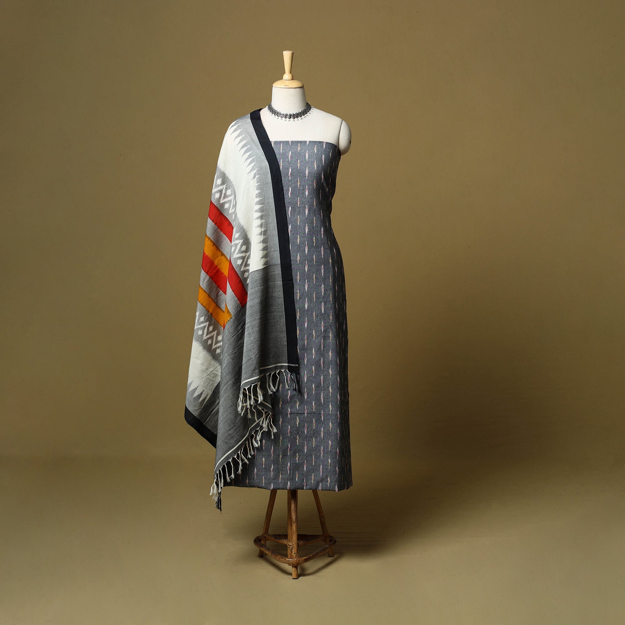 Grey pochampally ikat handloom 3pc unstitched dress material is made from cotton and crafted using the ikat technique, where the warp and weft threads are dyed before weaving. Artisans then arrange the dyed threads on the loom in a set sequence, allowing the pattern to form naturally as the fabric is woven. The set includes kurta fabric, a double ikat dupatta and a plain bottom. Rooted in a centuries-old weaving tradition, it’s a distinctive choice for festive occasions, weddings and refined everyday wear.