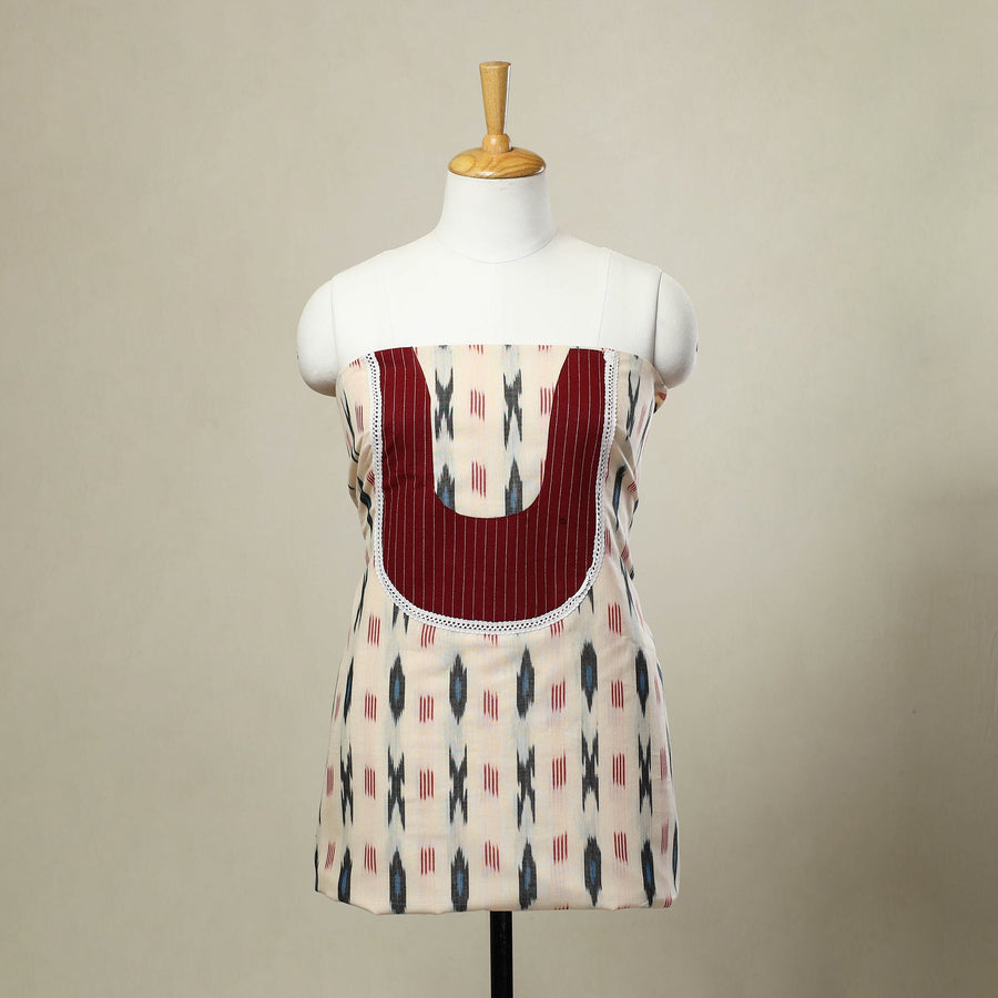 This beige pochampally Ikat patchwork cotton kurta material features vibrant, traditional patterns woven using the Ikat technique. Soft and breathable, it’s perfect for creating custom kurtas that beautifully blend cultural heritage with modern style.