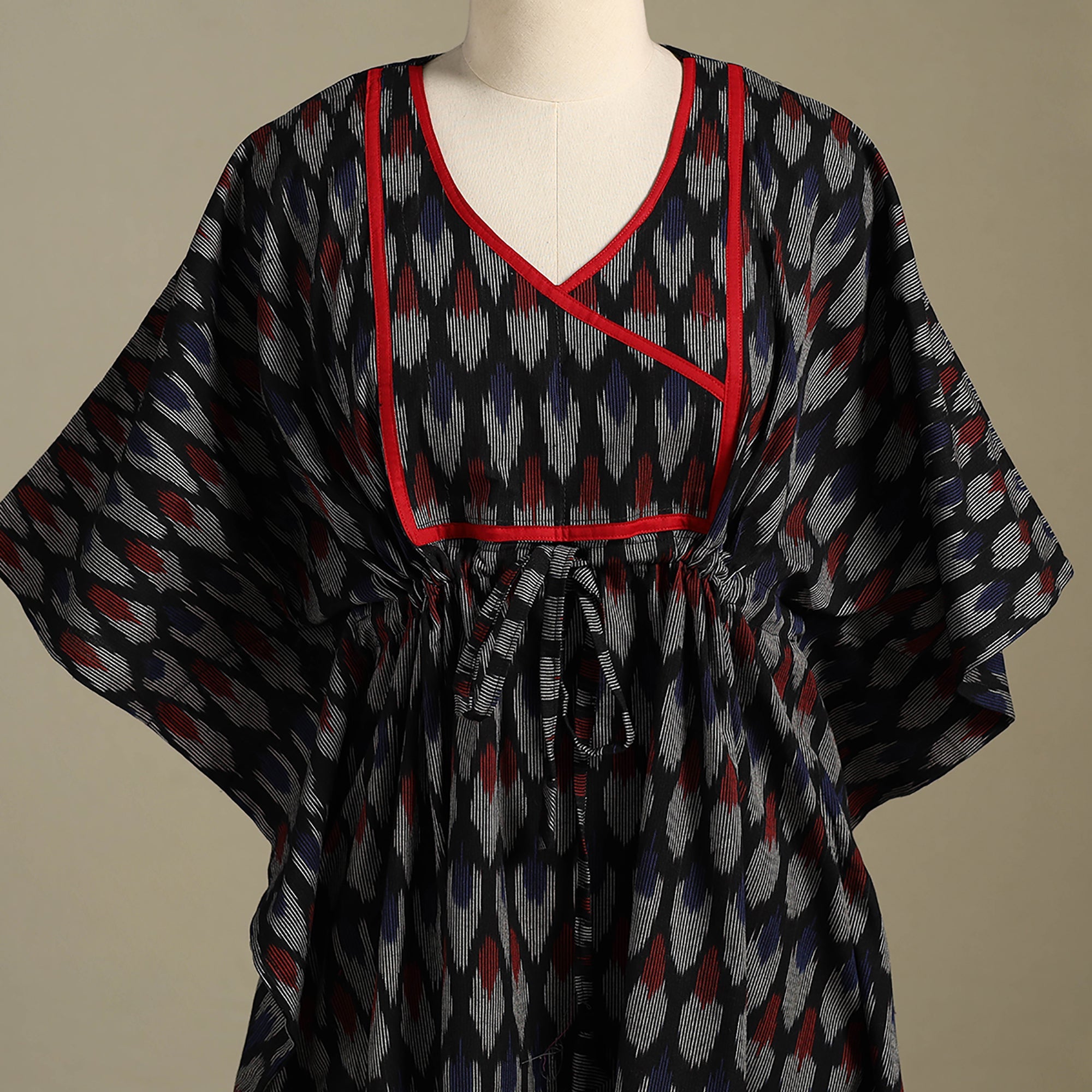 Wrap yourself in cultural artistry and comfort with this black pochampally ikat cotton kaftan. designed for effortless style. Made from breathable cotton, the kaftan drapes gracefully with its relaxed fit, while the adjustable drawstring waist ensures a custom fit ideal for lounging, vacations, or casual day outs.