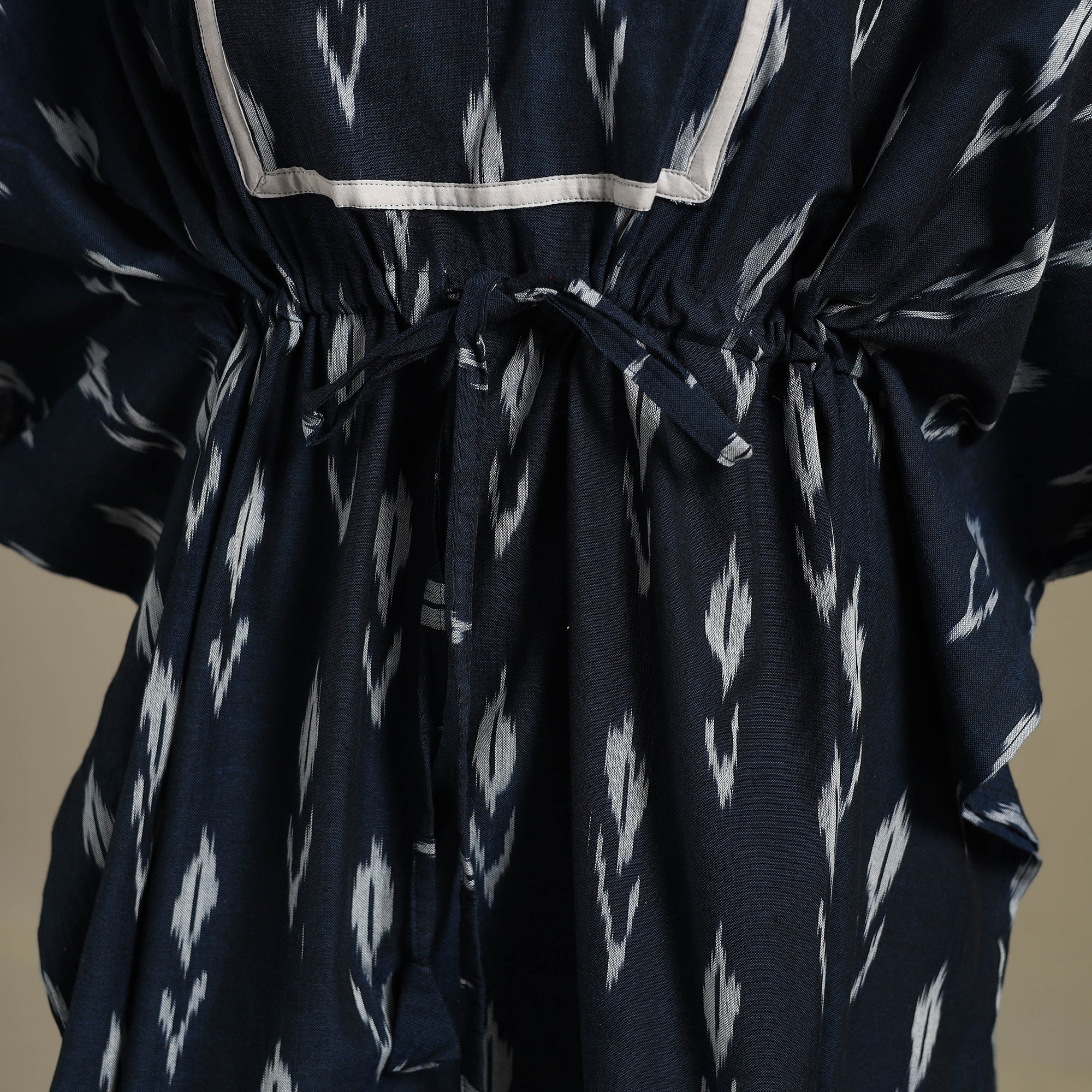 Wrap yourself in cultural artistry and comfort with this blue pochampally ikat cotton kaftan. designed for effortless style. Made from breathable cotton, the kaftan drapes gracefully with its relaxed fit, while the adjustable drawstring waist ensures a custom fit ideal for lounging, vacations, or casual day outs.