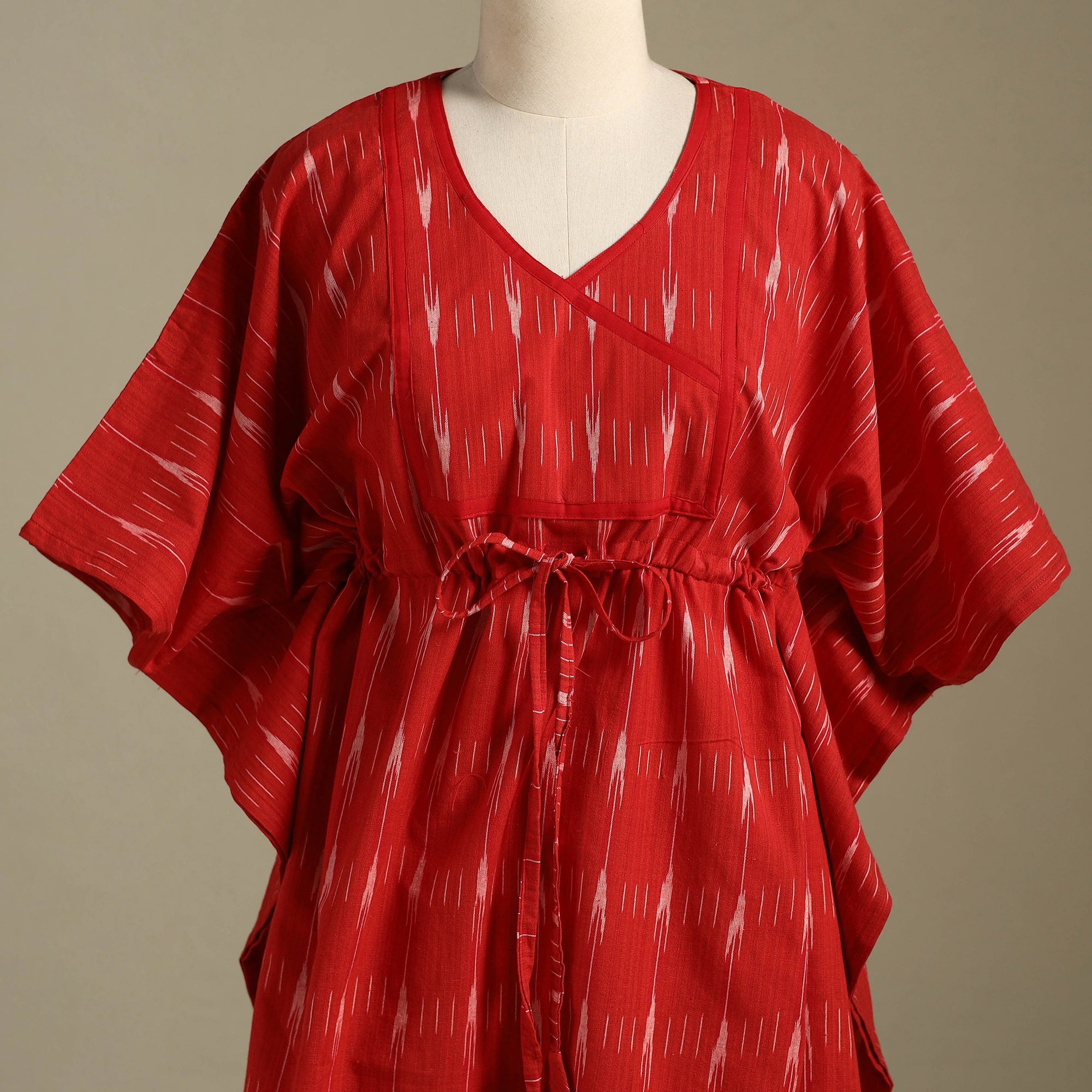 Wrap yourself in cultural artistry and comfort with this red pochampally ikat cotton kaftan. designed for effortless style. Made from breathable cotton, the kaftan drapes gracefully with its relaxed fit, while the adjustable drawstring waist ensures a custom fit ideal for lounging, vacations, or casual day outs.