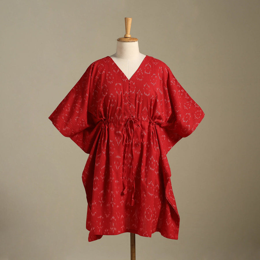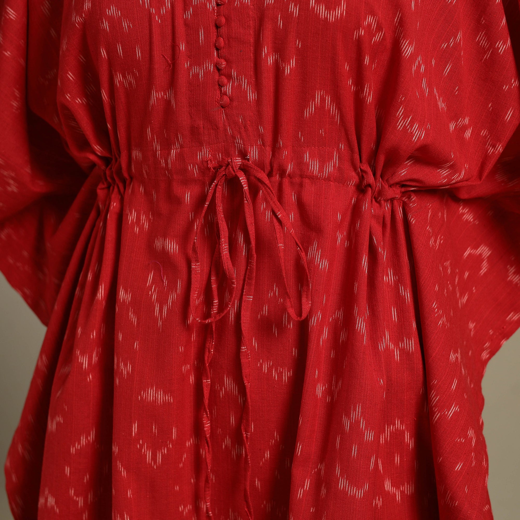 Wrap yourself in cultural artistry and comfort with this red pochampally ikat cotton kaftan. designed for effortless style. Made from breathable cotton, the kaftan drapes gracefully with its relaxed fit, while the adjustable drawstring waist ensures a custom fit ideal for lounging, vacations, or casual day outs.