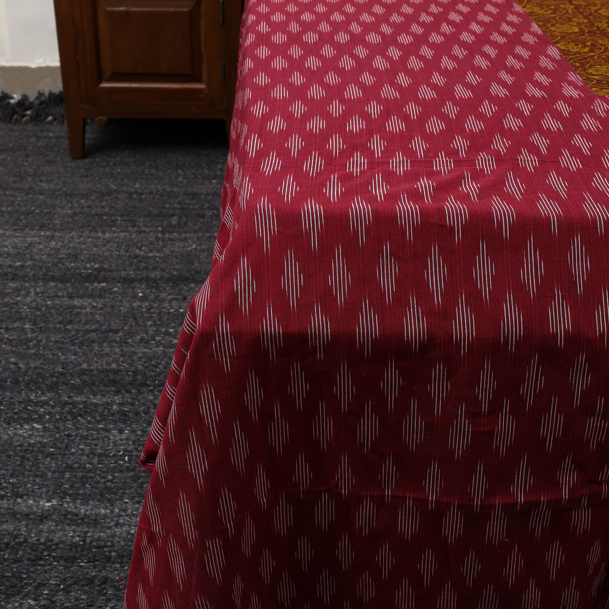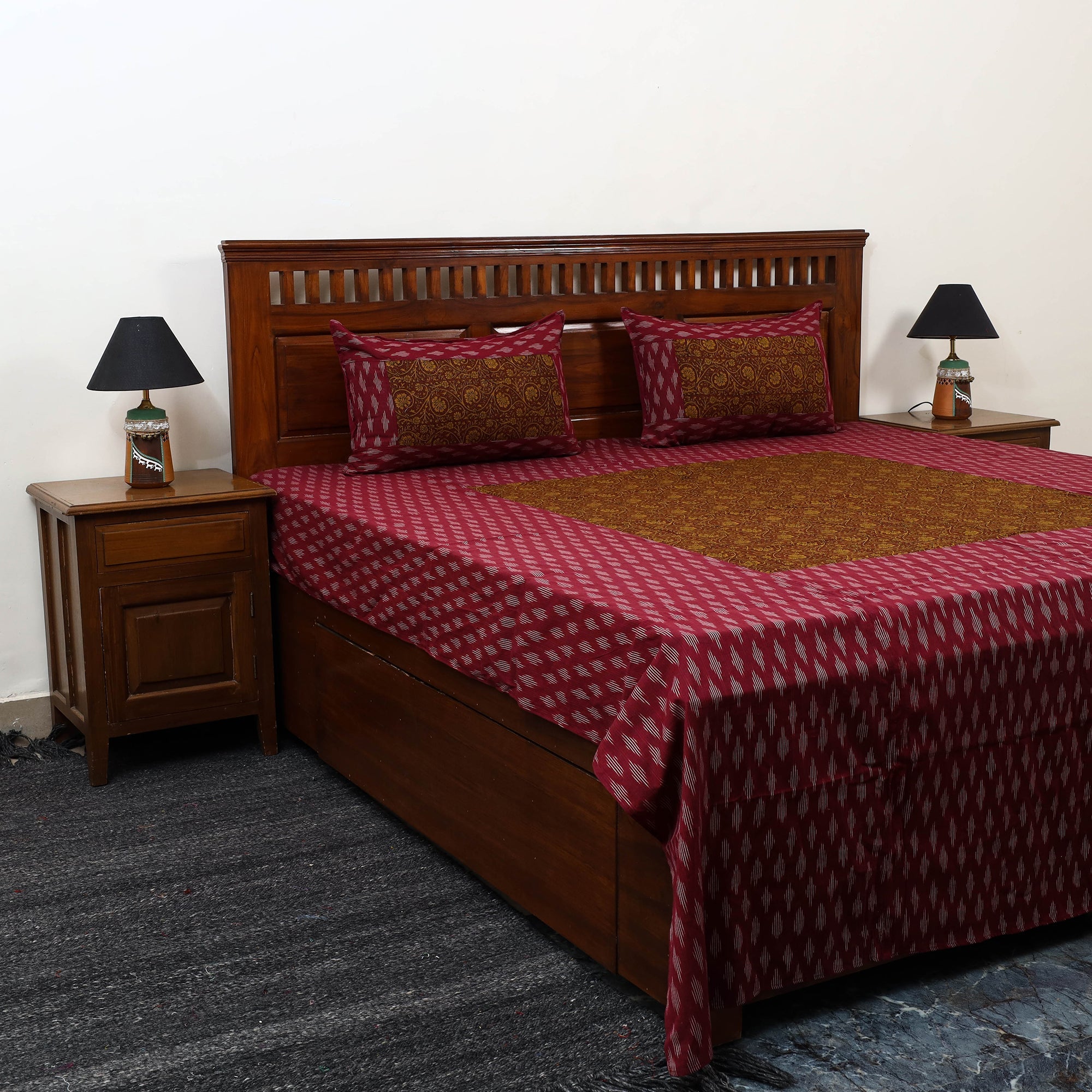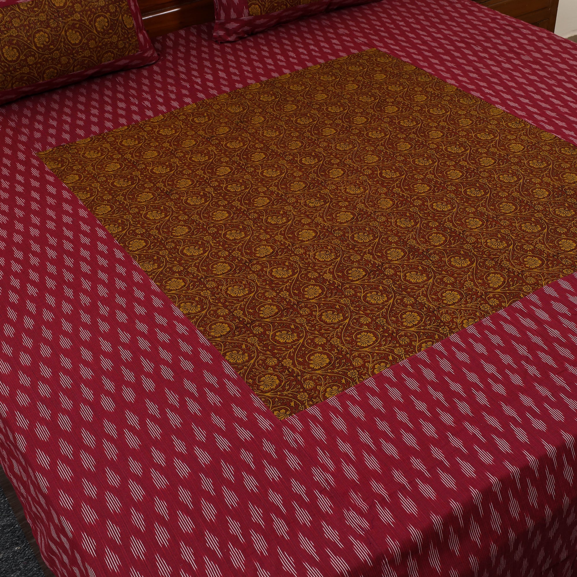 This maroon cotton bedsheet set features a beautiful blend of pochampally Ikat and bagh block print patchwork, showcasing traditional artistry with a modern touch. Made from breathable cotton, it ensures both comfort and durability. The intricate design adds a handmade charm to your space. The set includes one double bedsheet and two matching pillow covers, perfect for enhancing your home decor.