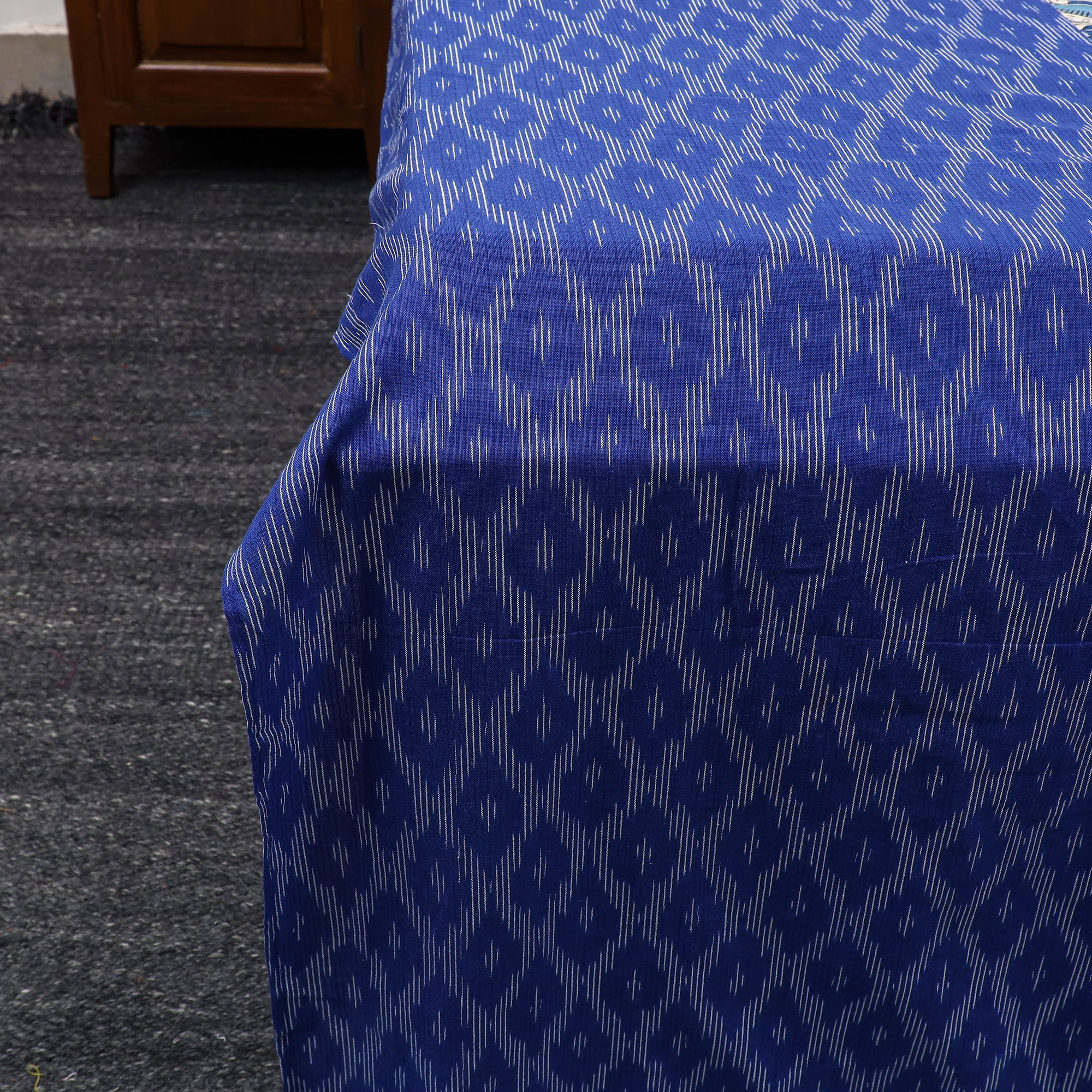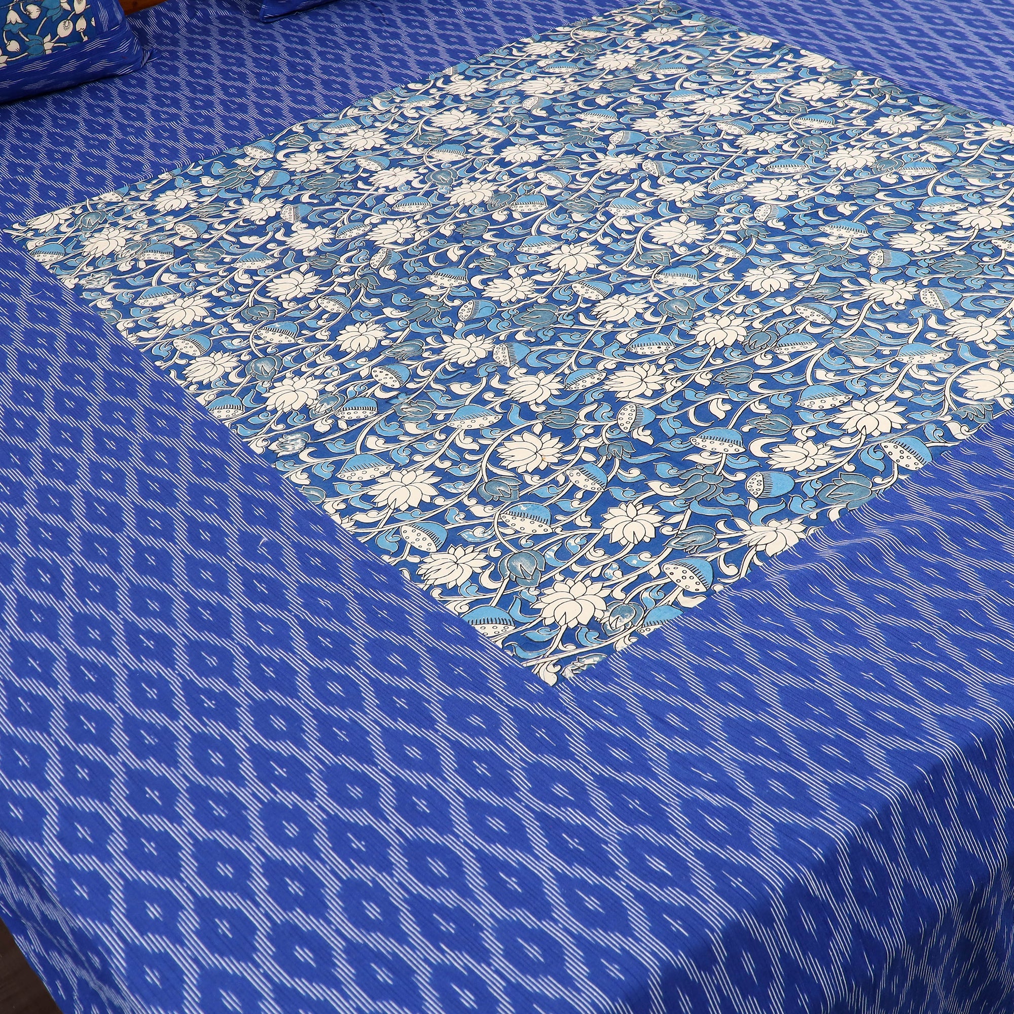This blue pochampally Ikat with kalamkari printed patch cotton bedsheet set brings together the charm of Indian crafts and detailed stitched patchwork. Made from soft cotton, it ensures both comfort and durability. The patch design adds a distinct character to the base. The set includes one double bedsheet and two matching pillow covers, offering a handcrafted appeal.