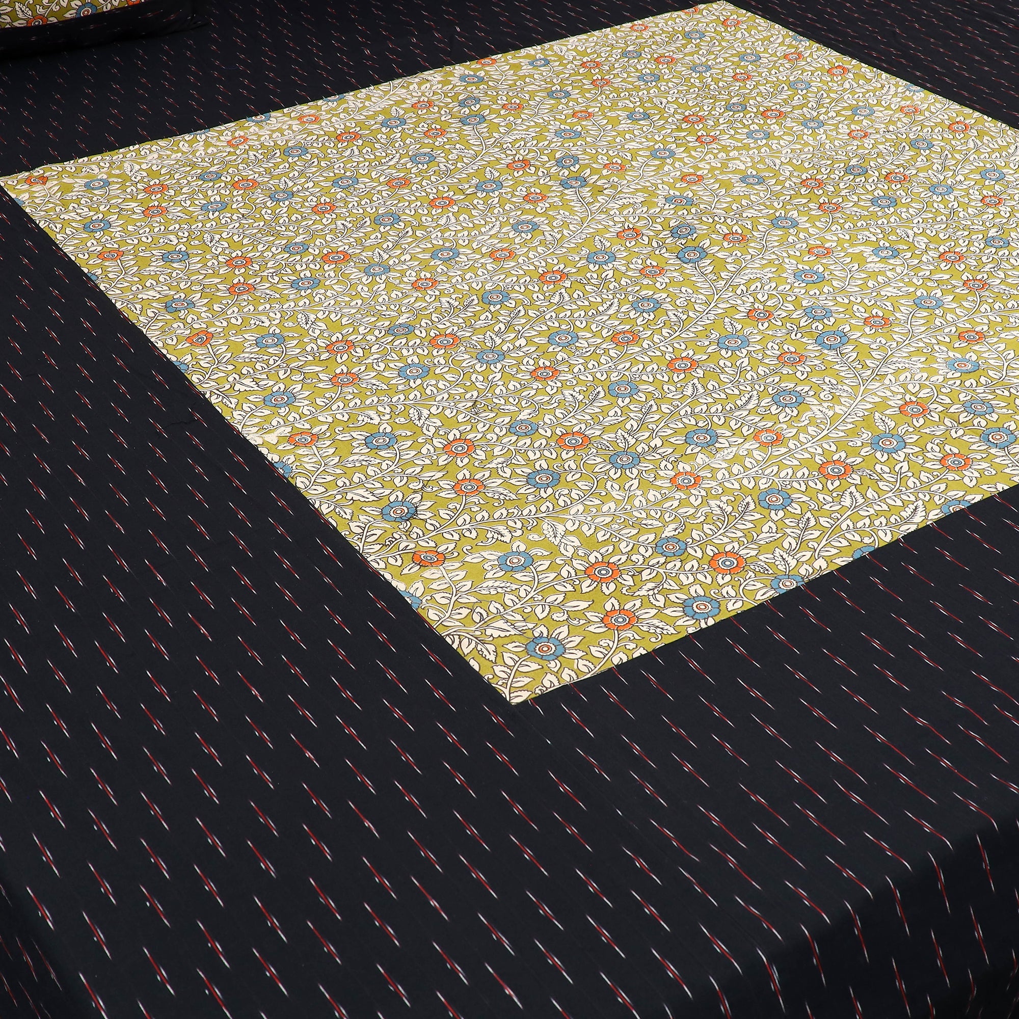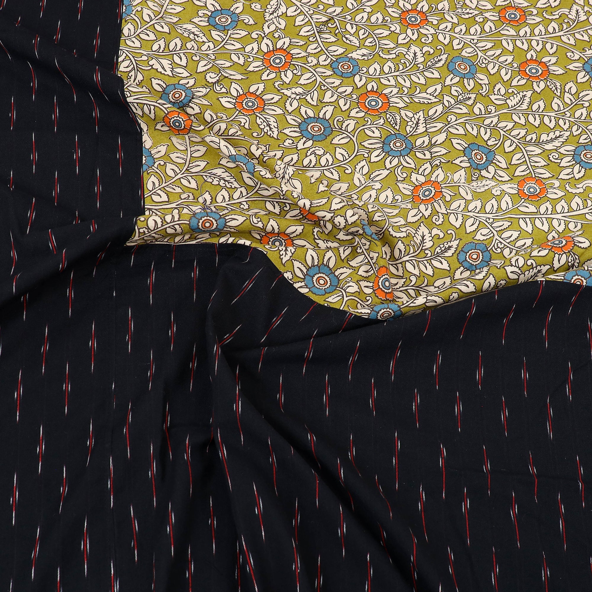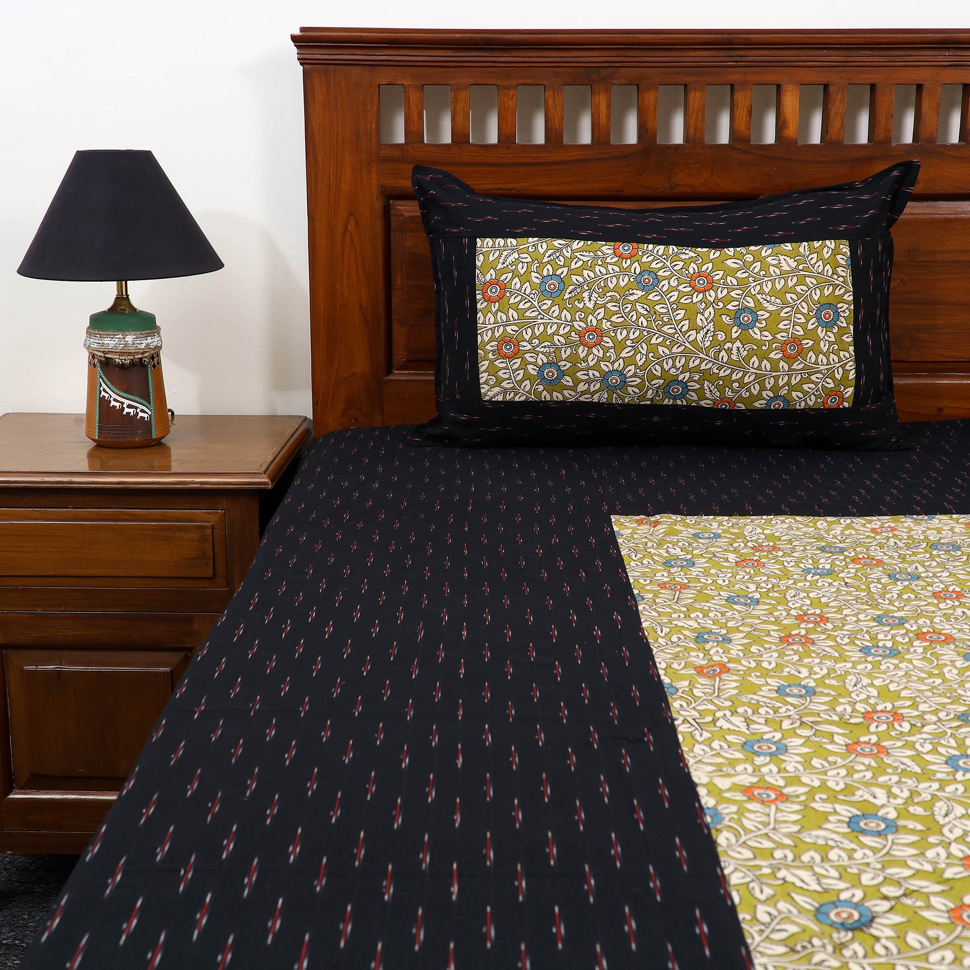 This black pochampally Ikat with kalamkari printed patch cotton bedsheet set brings together the charm of Indian crafts and detailed stitched patchwork. Made from soft cotton, it ensures both comfort and durability. The patch design adds a distinct character to the base. The set includes one double bedsheet and two matching pillow covers, offering a handcrafted appeal.