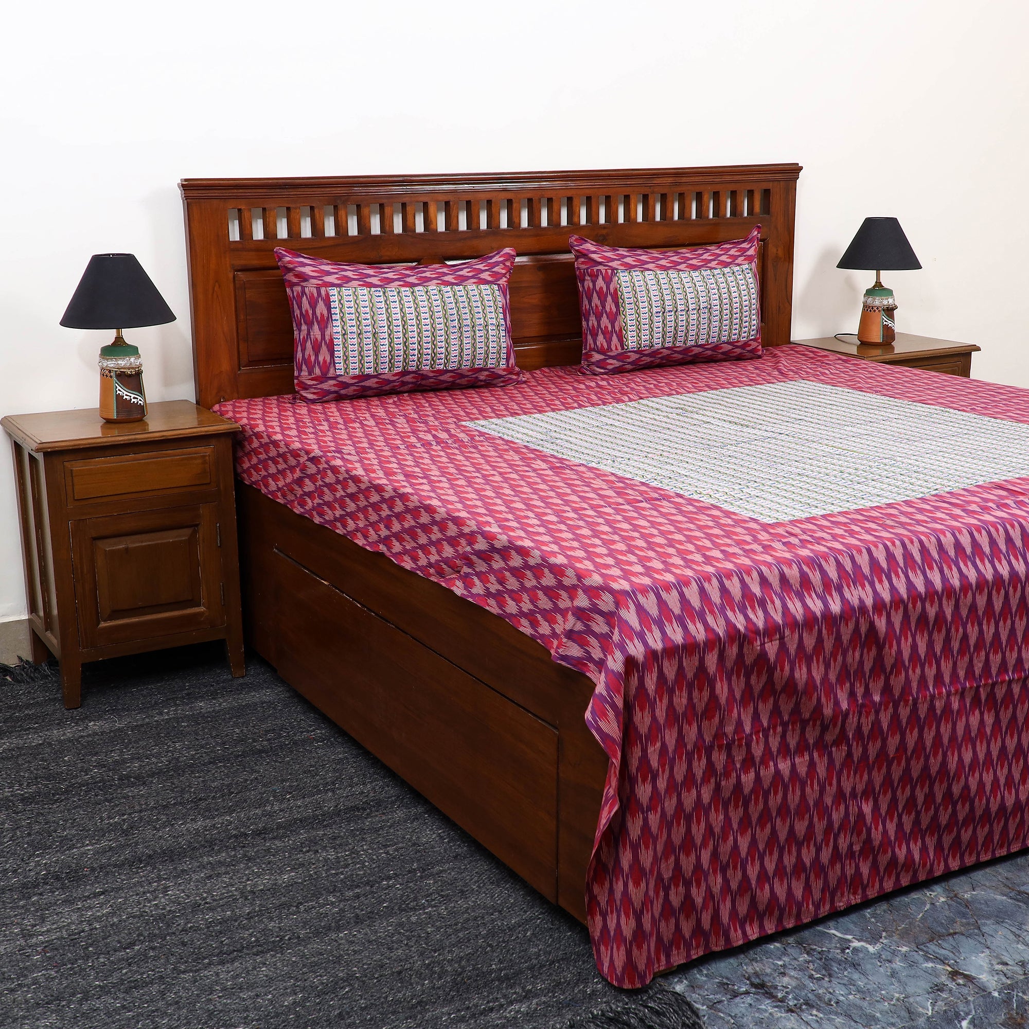 This purple pochampally Ikat with sanganeri block print patch cotton bedsheet set blends two iconic Indian crafts with delicate stitched patchwork. Made from soft cotton, it ensures both comfort and lasting use. The vibrant patch design brings a distinct flair to the base. This set includes one double bedsheet and two coordinated pillow covers, ideal for adding a handcrafted charm to your room.