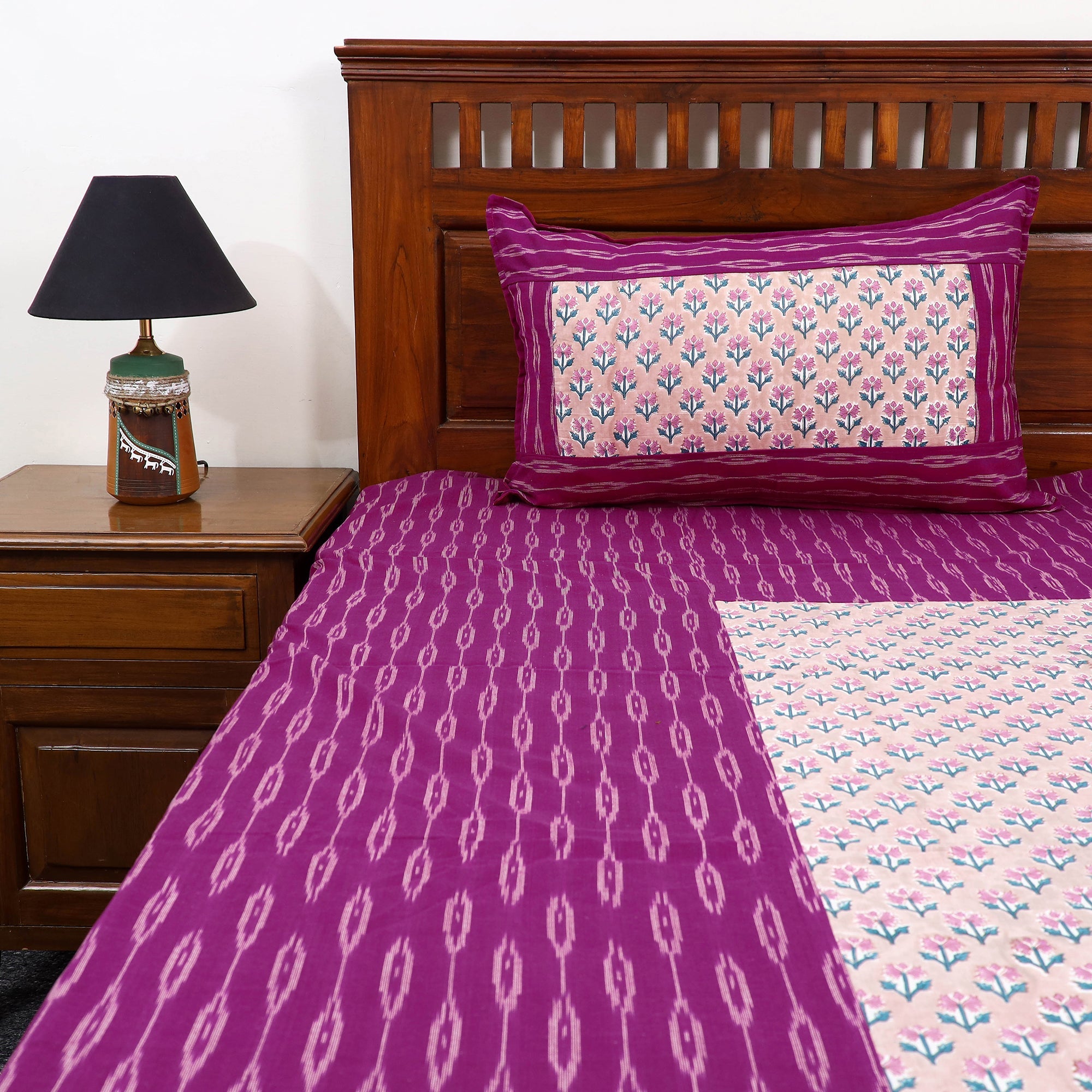 This purple pochampally Ikat with sanganeri block print patch cotton bedsheet set blends two iconic Indian crafts with delicate stitched patchwork. Made from soft cotton, it ensures both comfort and lasting use. The vibrant patch design brings a distinct flair to the base. This set includes one double bedsheet and two coordinated pillow covers, ideal for adding a handcrafted charm to your room.