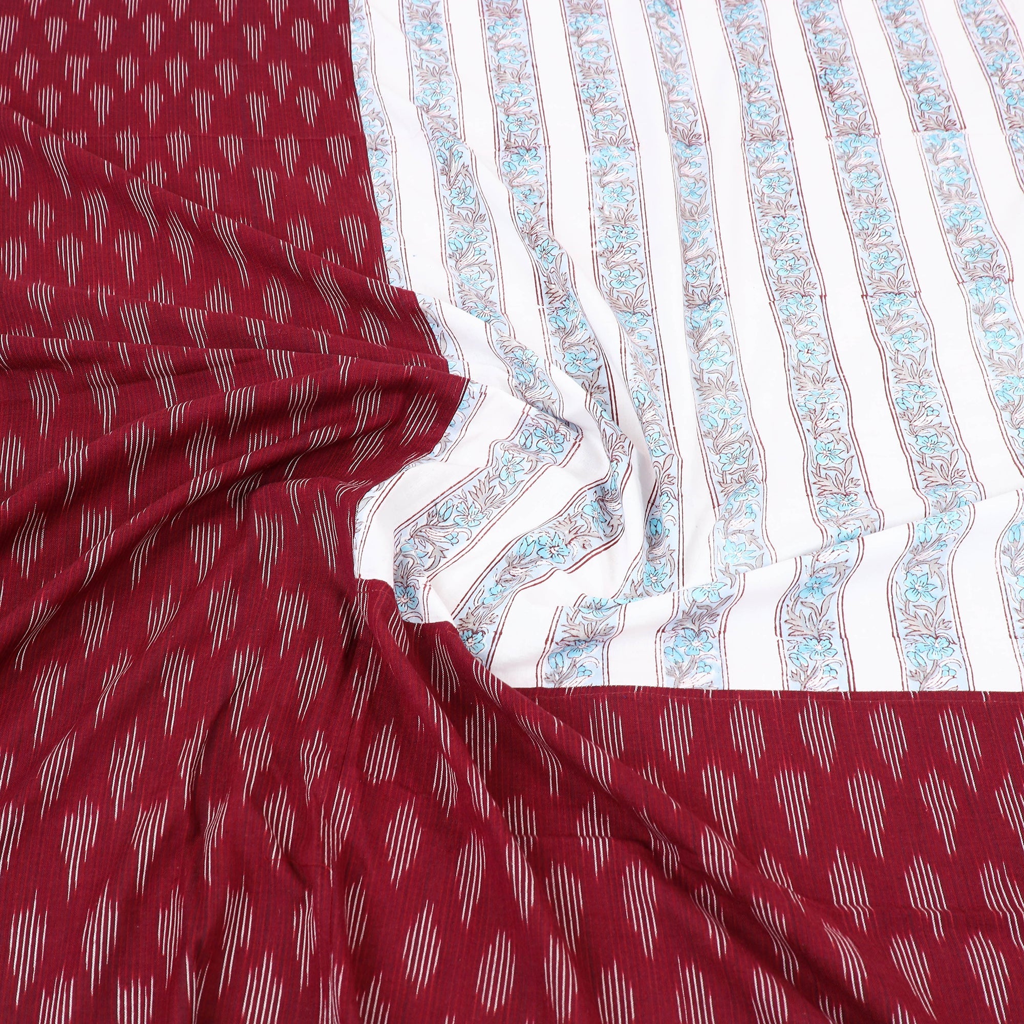 This maroon pochampally Ikat with sanganeri block print patch cotton bedsheet set blends two iconic Indian crafts with delicate stitched patchwork. Made from soft cotton, it ensures both comfort and lasting use. The vibrant patch design brings a distinct flair to the base. This set includes one double bedsheet and two coordinated pillow covers, ideal for adding a handcrafted charm to your room.