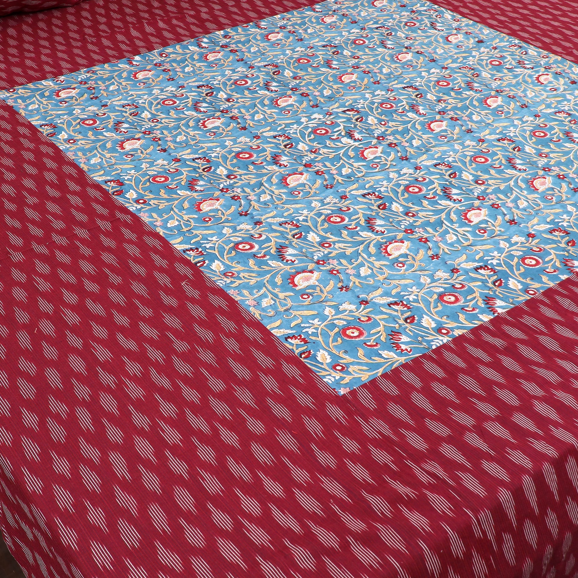 This maroon pochampally Ikat with sanganeri block print patch cotton bedsheet set blends two iconic Indian crafts with delicate stitched patchwork. Made from soft cotton, it ensures both comfort and lasting use. The vibrant patch design brings a distinct flair to the base. This set includes one double bedsheet and two coordinated pillow covers, ideal for adding a handcrafted charm to your room.