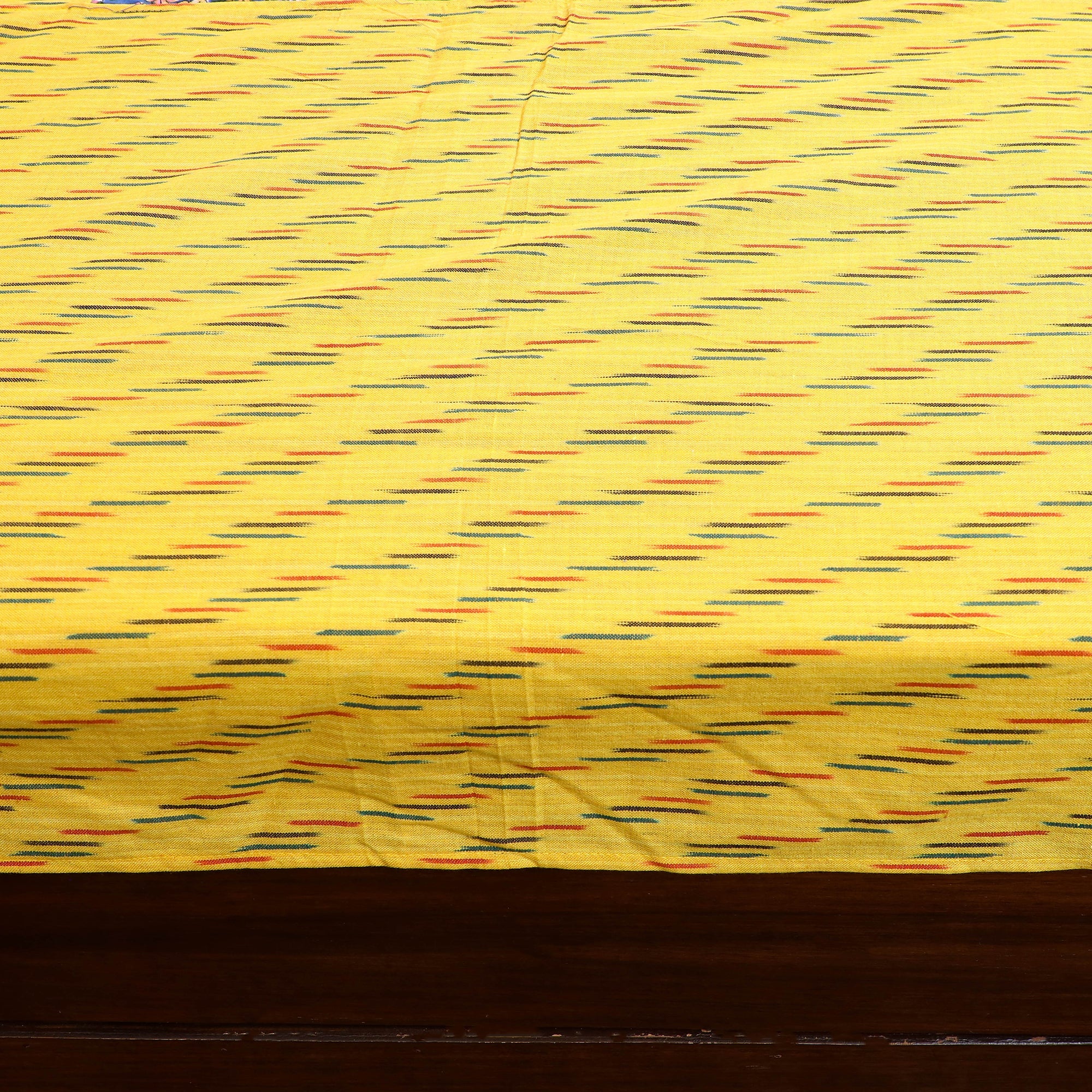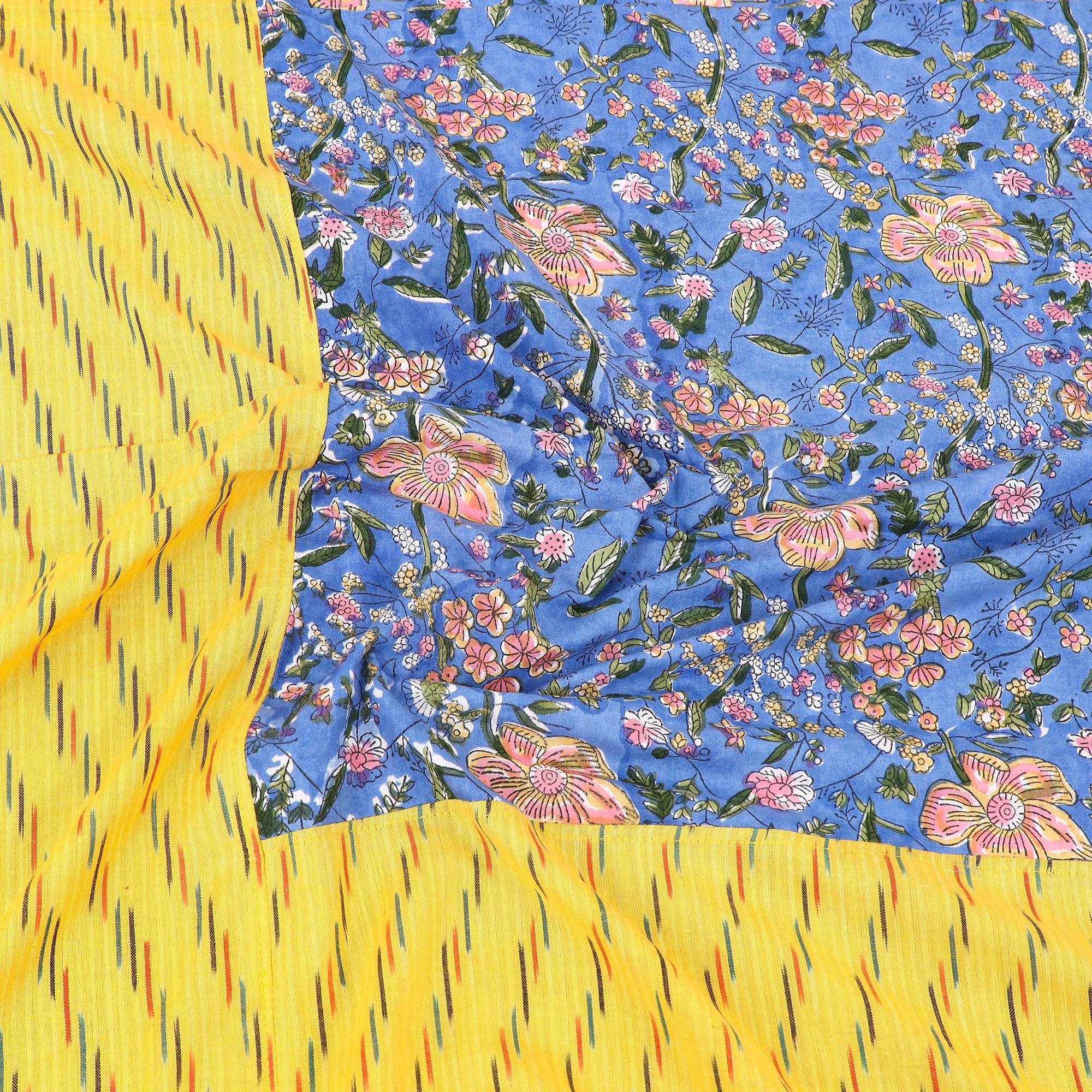 This yellow pochampally Ikat with sanganeri block print patch cotton bedsheet set blends two iconic Indian crafts with delicate stitched patchwork. Made from soft cotton, it ensures both comfort and lasting use. The vibrant patch design brings a distinct flair to the base. This set includes one double bedsheet and two coordinated pillow covers, ideal for adding a handcrafted charm to your room.