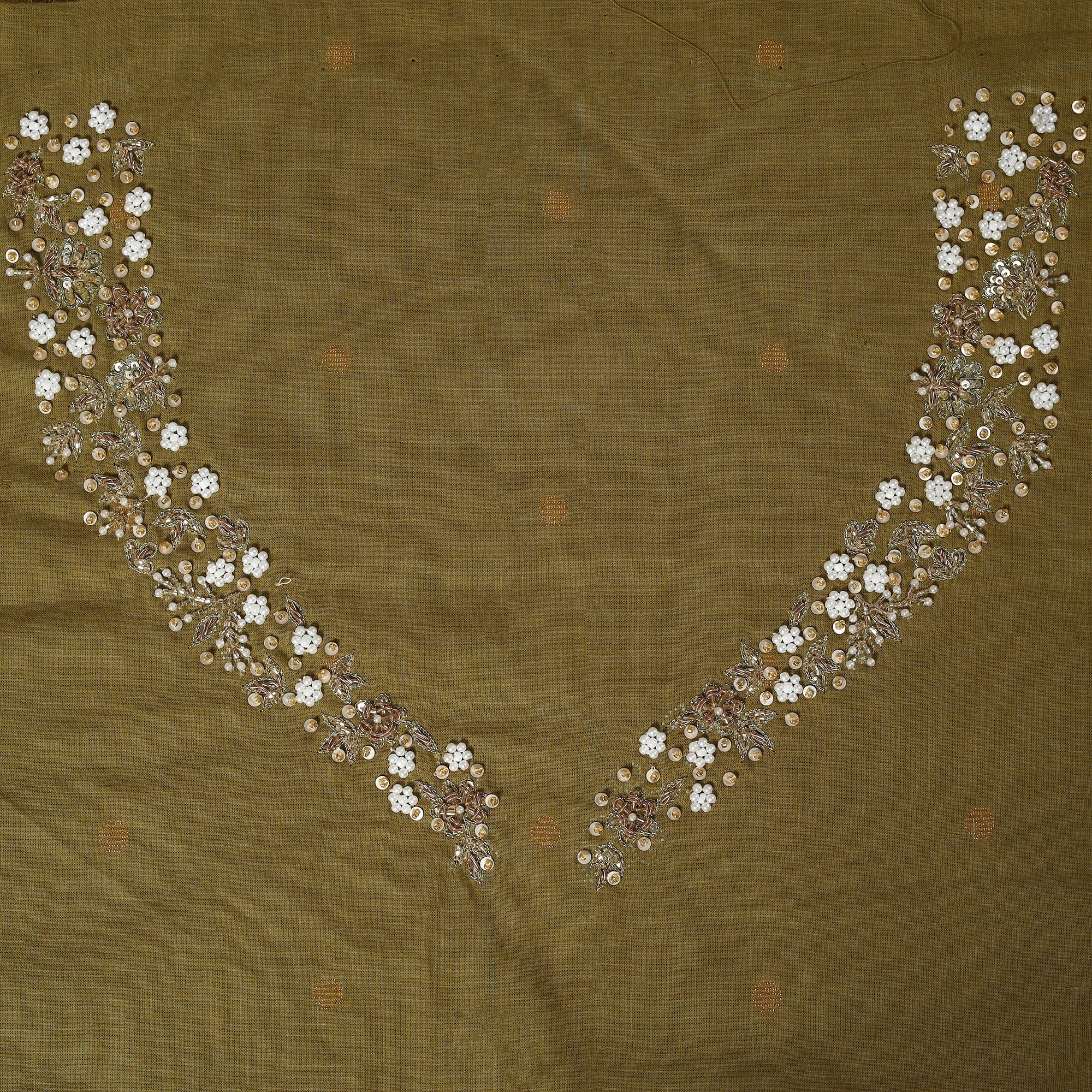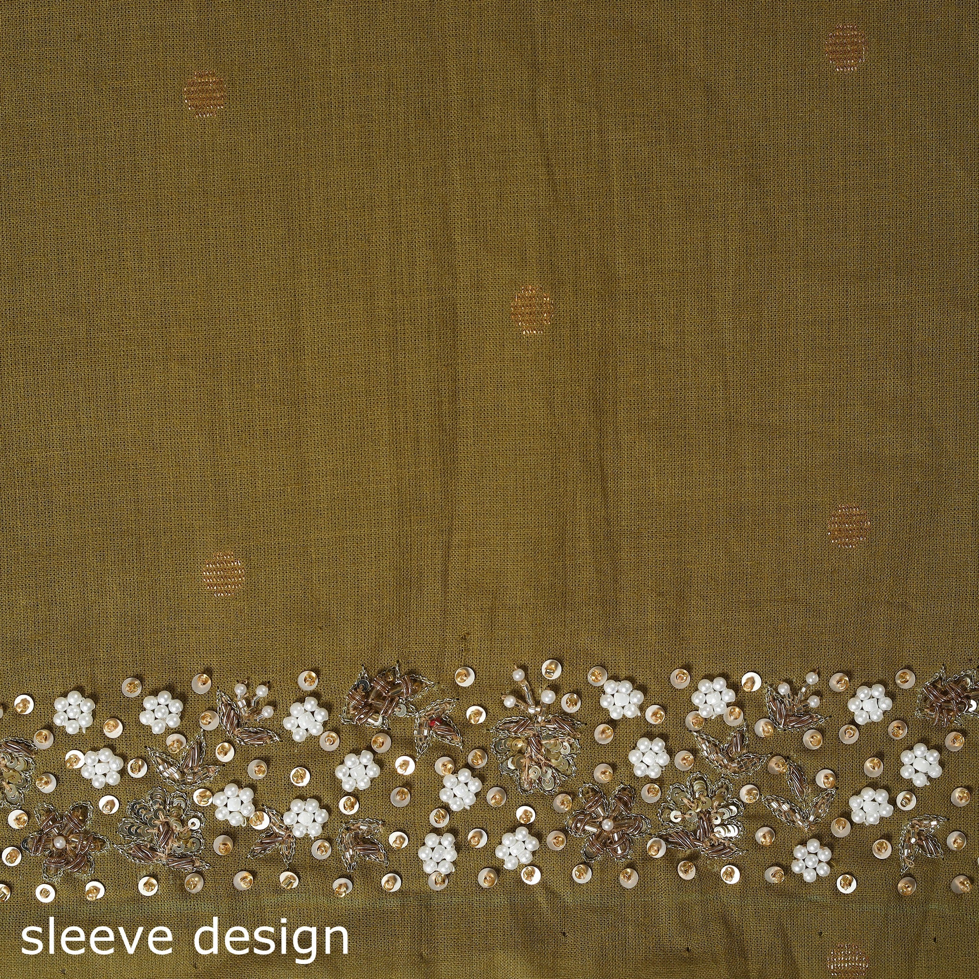 This handcrafted green blouse piece features intricate hand embroidery on polka dot zari buti cotton fabric, offering a blend of traditional art and everyday comfort. Ideal for pairing with sarees, it can be used to create stylish blouses for casual wear or festive occasions.
