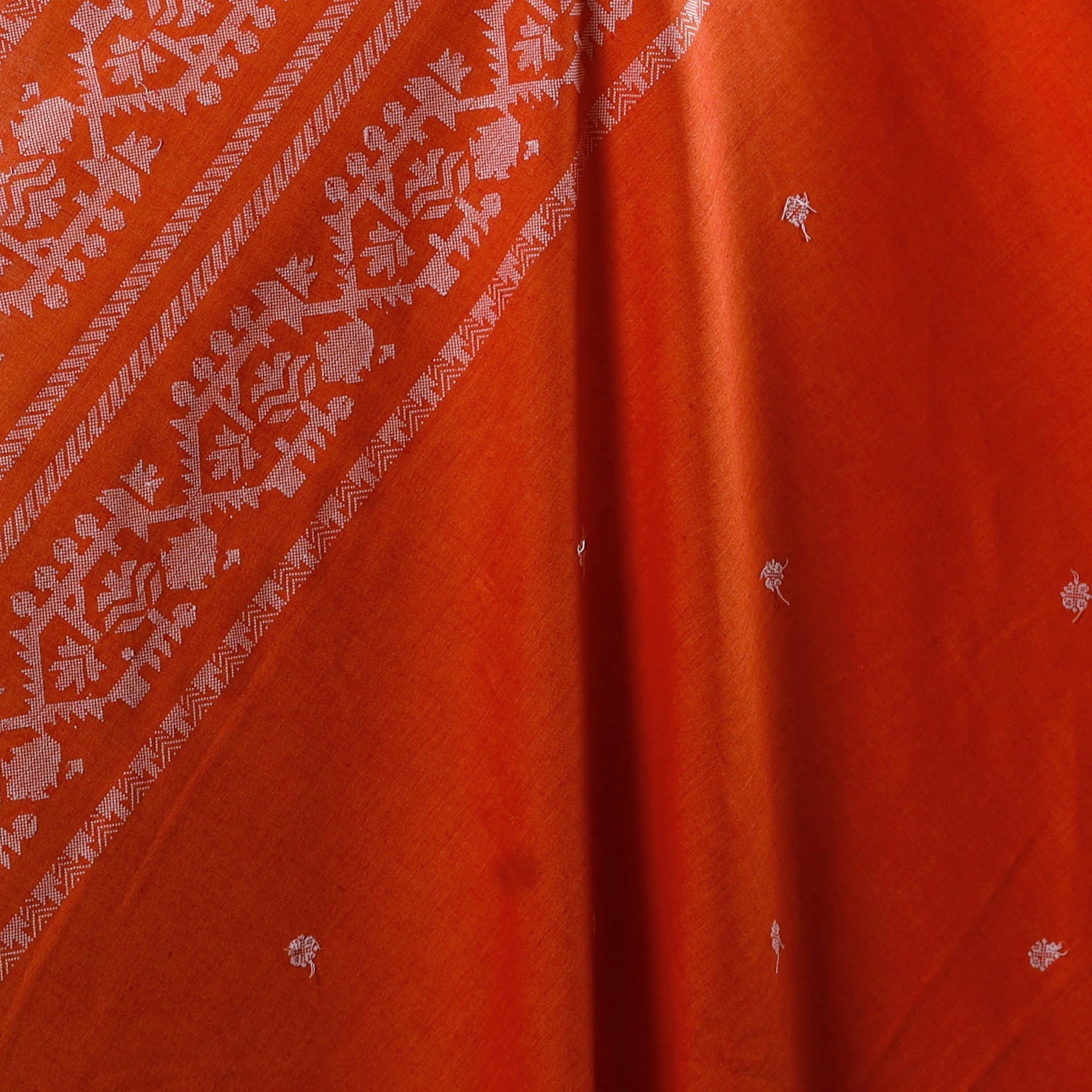 Originating from the skilled weavers of Tamil Nadu, this orange jacquard cotton fabric beautifully merges traditional motifs with contemporary weaving. The prewashed texture offers a smooth, easy drape, ideal for crafting graceful kurtas, dresses or home decor pieces.