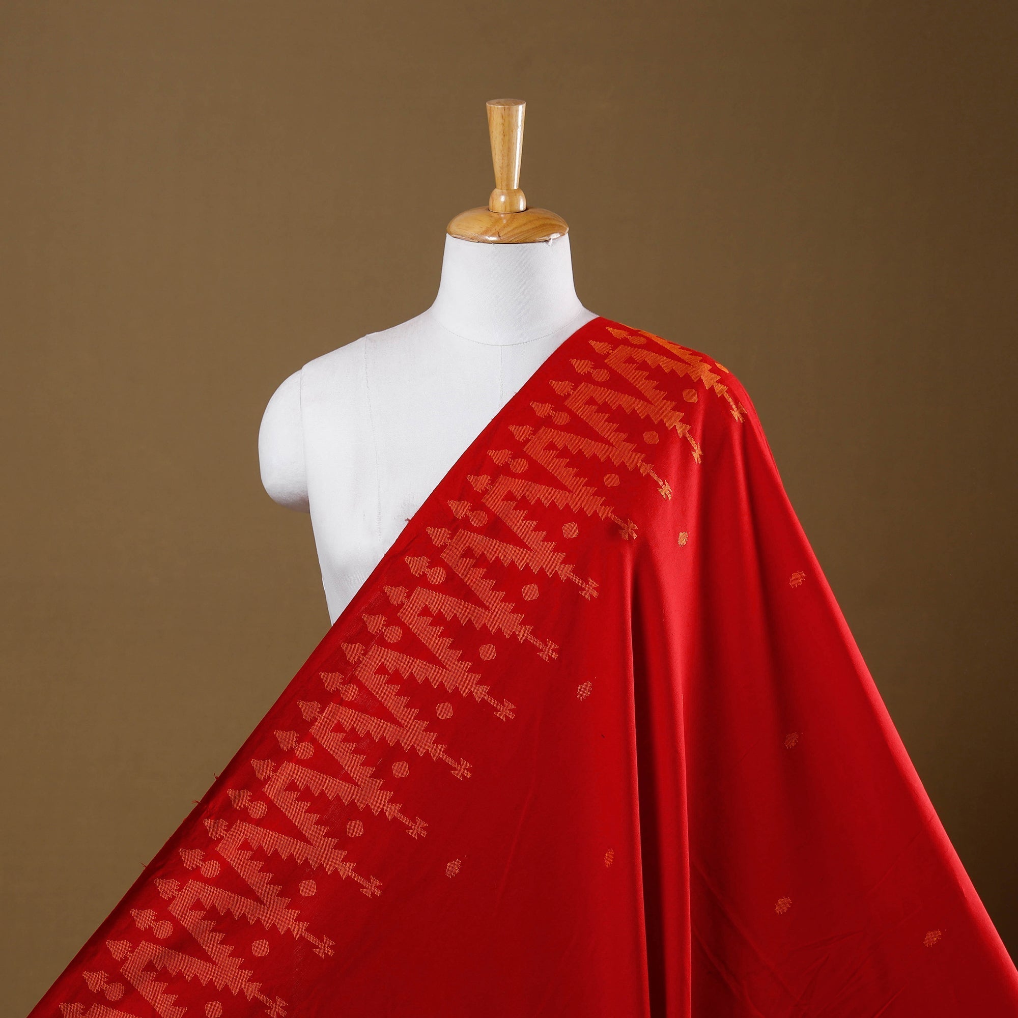 Originating from the skilled weavers of Tamil Nadu, this red jacquard cotton fabric beautifully merges traditional motifs with contemporary weaving. The prewashed texture offers a smooth, easy drape, ideal for crafting graceful kurtas, dresses, or home decor pieces.