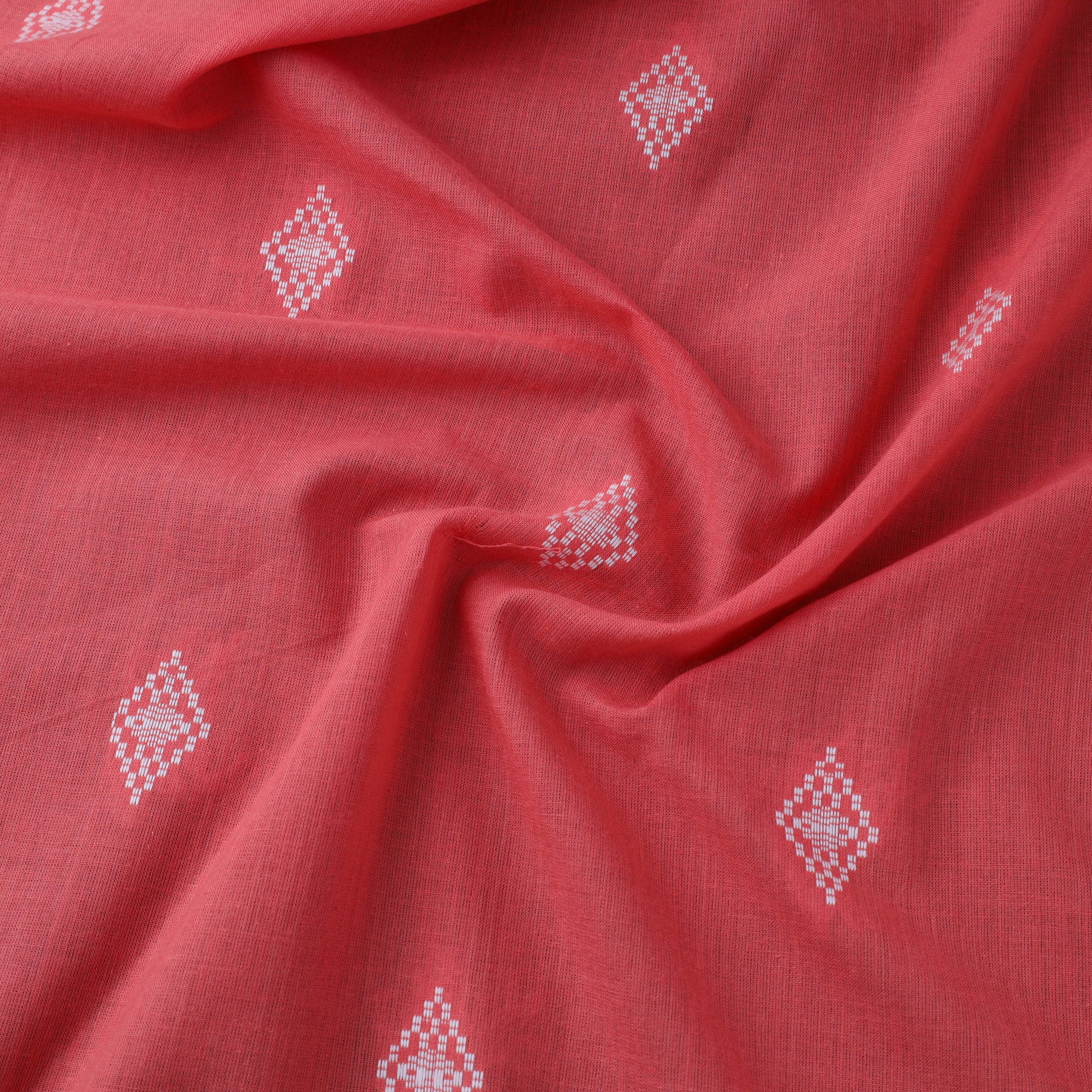 Woven in Telangana, this pink jacquard cotton fabric showcases a traditional-inspired pattern through a modern weaving technique. Its prewashed texture adds softness, making it ideal for crafting kurtas, dresses, or home décor accents. While machine-made, it carries the essence of India’s rich textile heritage. Elegant, sturdy, and versatile, it suits both daily wear and festive projects seamlessly.