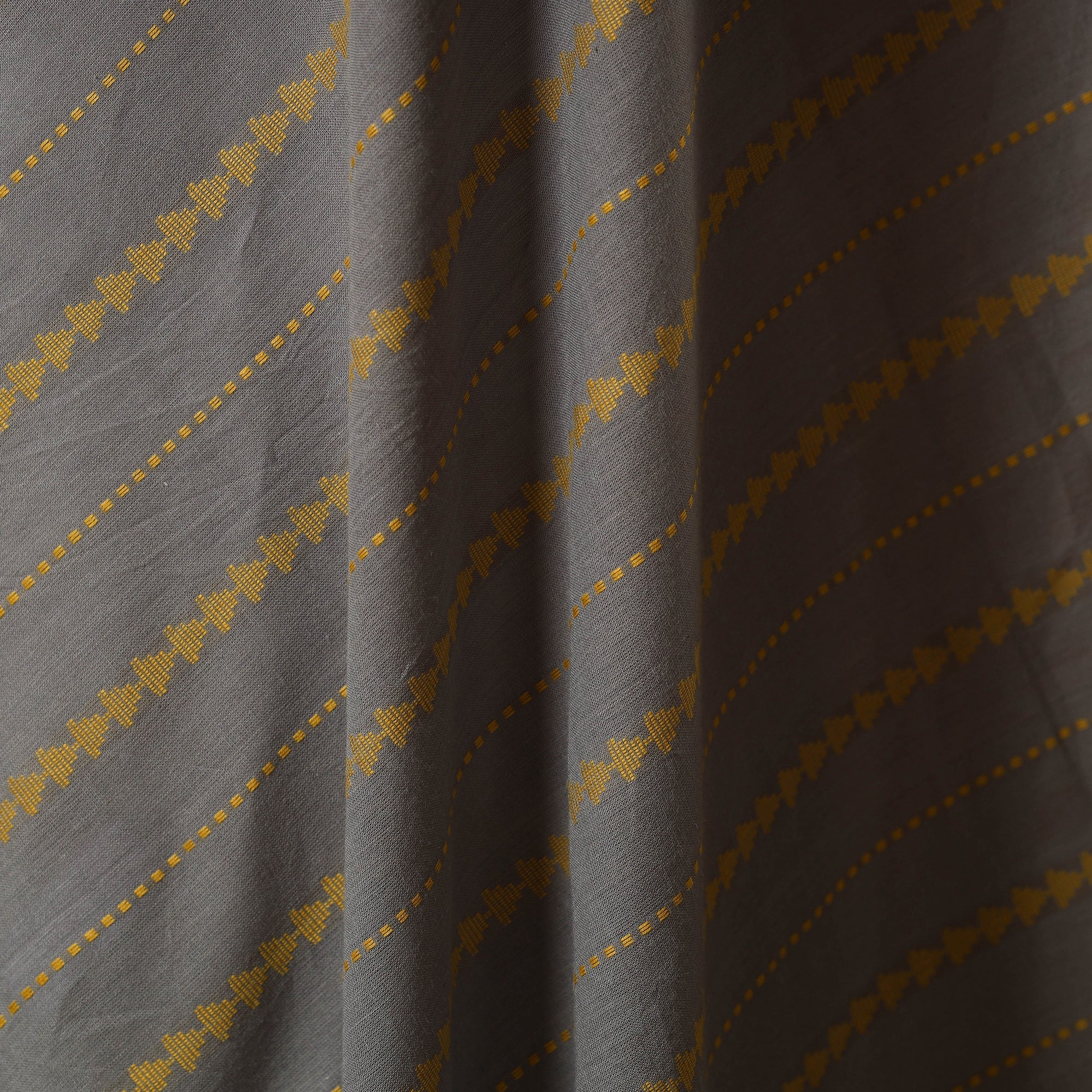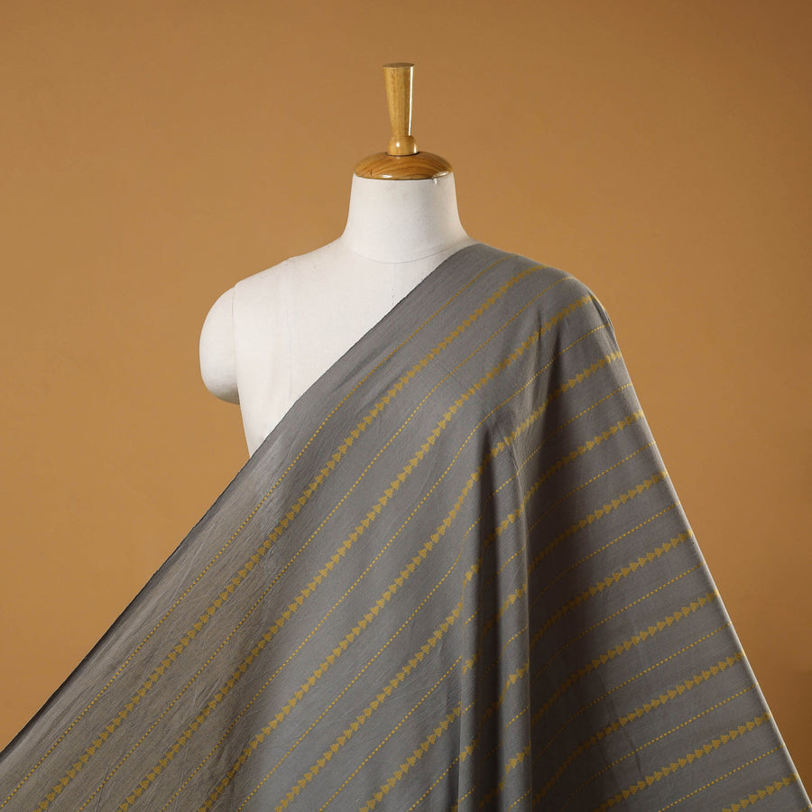 Woven in Telangana, this grey jacquard cotton fabric showcases a traditionally inspired pattern created through modern jacquard weaving. Its prewashed finish lends a smooth, soft touch, making it ideal for kurtas, dresses, or home décor accents. Though machine-woven, it beautifully captures the richness of India’s textile heritage.