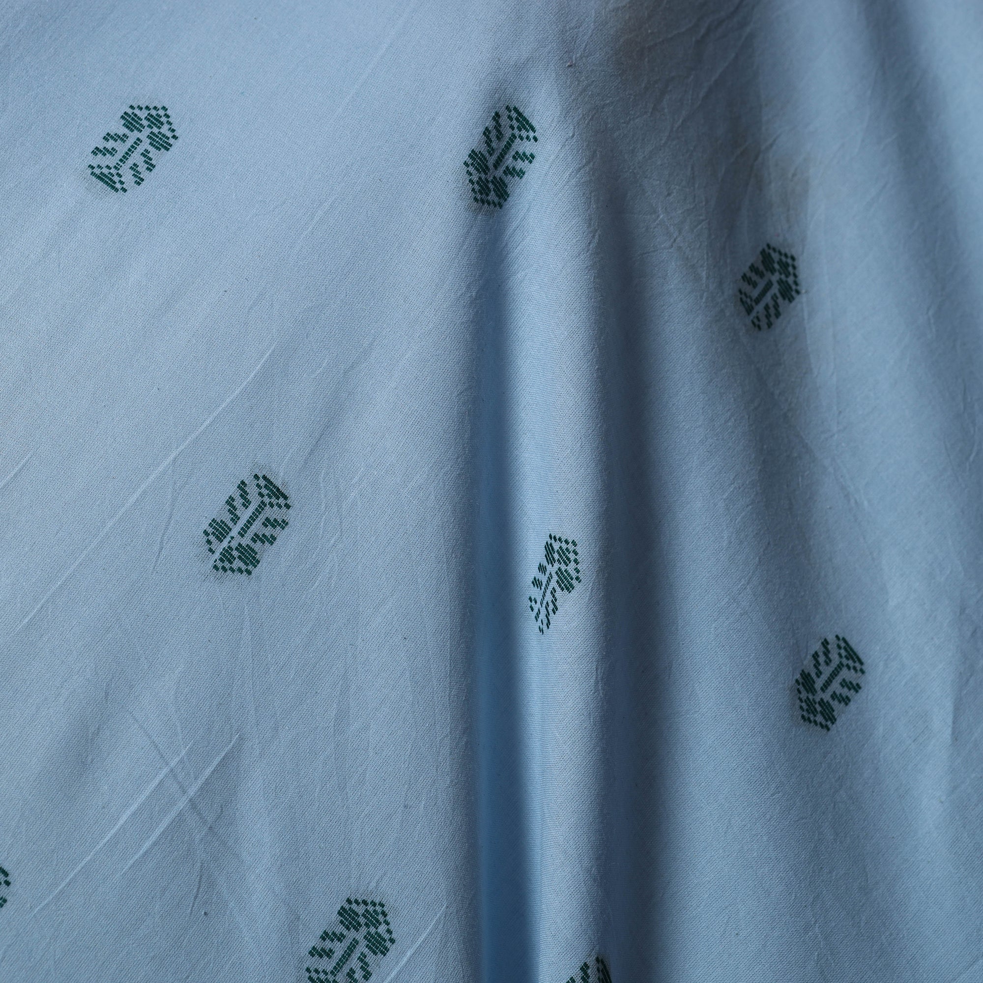 Woven in Tamil Nadu, this blue jacquard cotton fabric highlights a traditional-inspired pattern crafted through modern jacquard weaving. Its prewashed finish adds a smooth, soft touch, making it perfect for kurtas, dresses, or home décor accents. While machine-woven, it beautifully reflects the richness of India’s textile heritage.