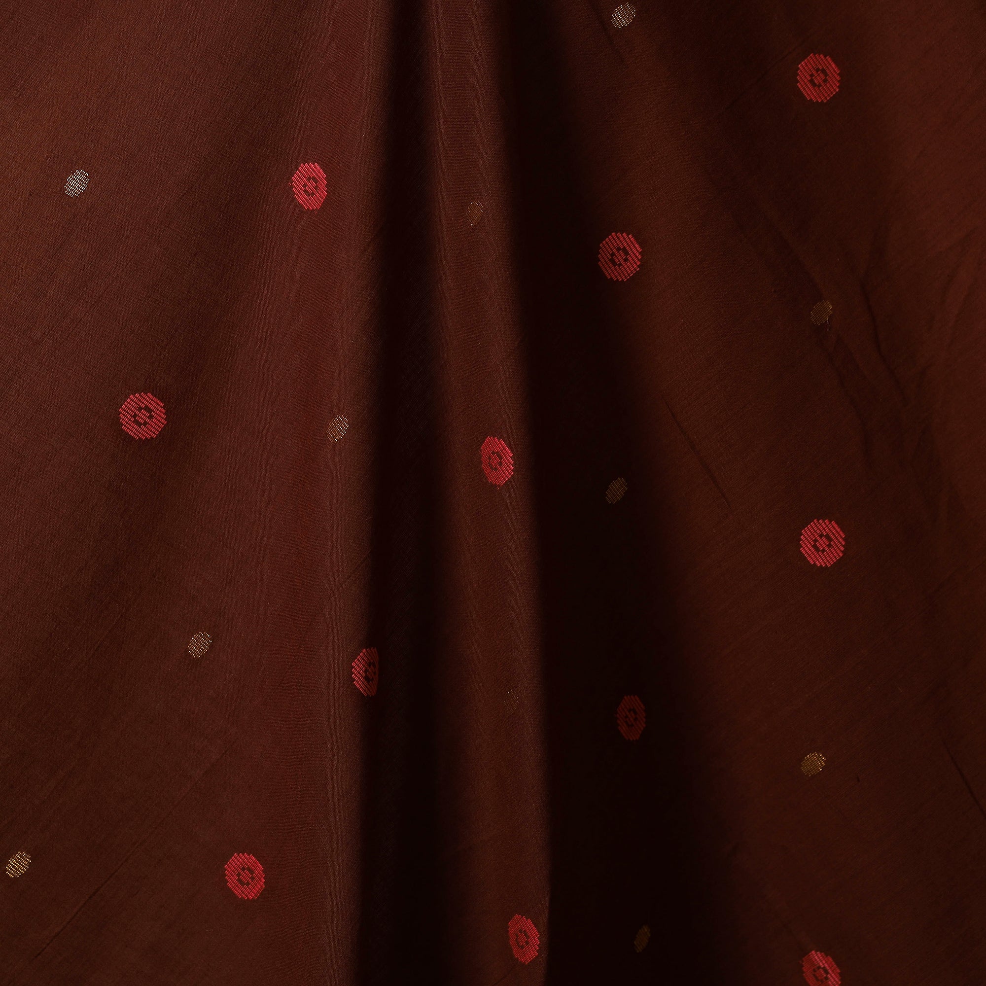 Woven in Telangana, this brown jacquard cotton fabric features a traditionally inspired pattern created through modern weaving techniques. Its prewashed finish lends a smooth, soft touch, making it ideal for kurtas, dresses, or home décor accents. Though machine-woven, it beautifully reflects the richness of India’s textile heritage.