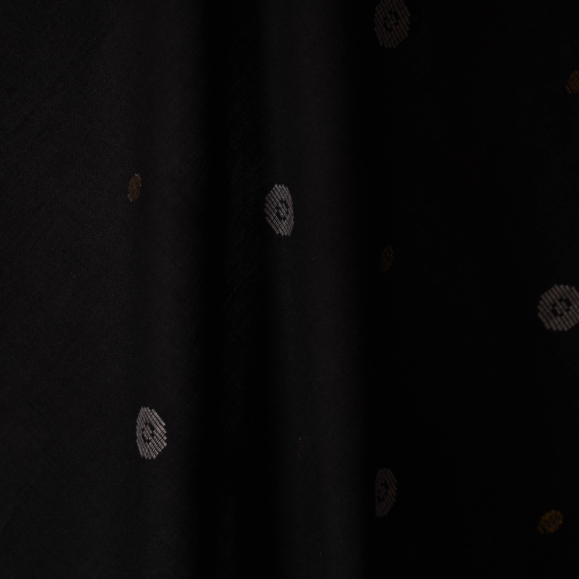 Woven in Telangana, this black jacquard cotton fabric features a traditionally inspired pattern created through modern weaving techniques. Its prewashed finish lends a smooth, soft touch, making it ideal for kurtas, dresses, or home décor accents. Though machine-woven, it beautifully reflects the richness of India’s textile heritage.