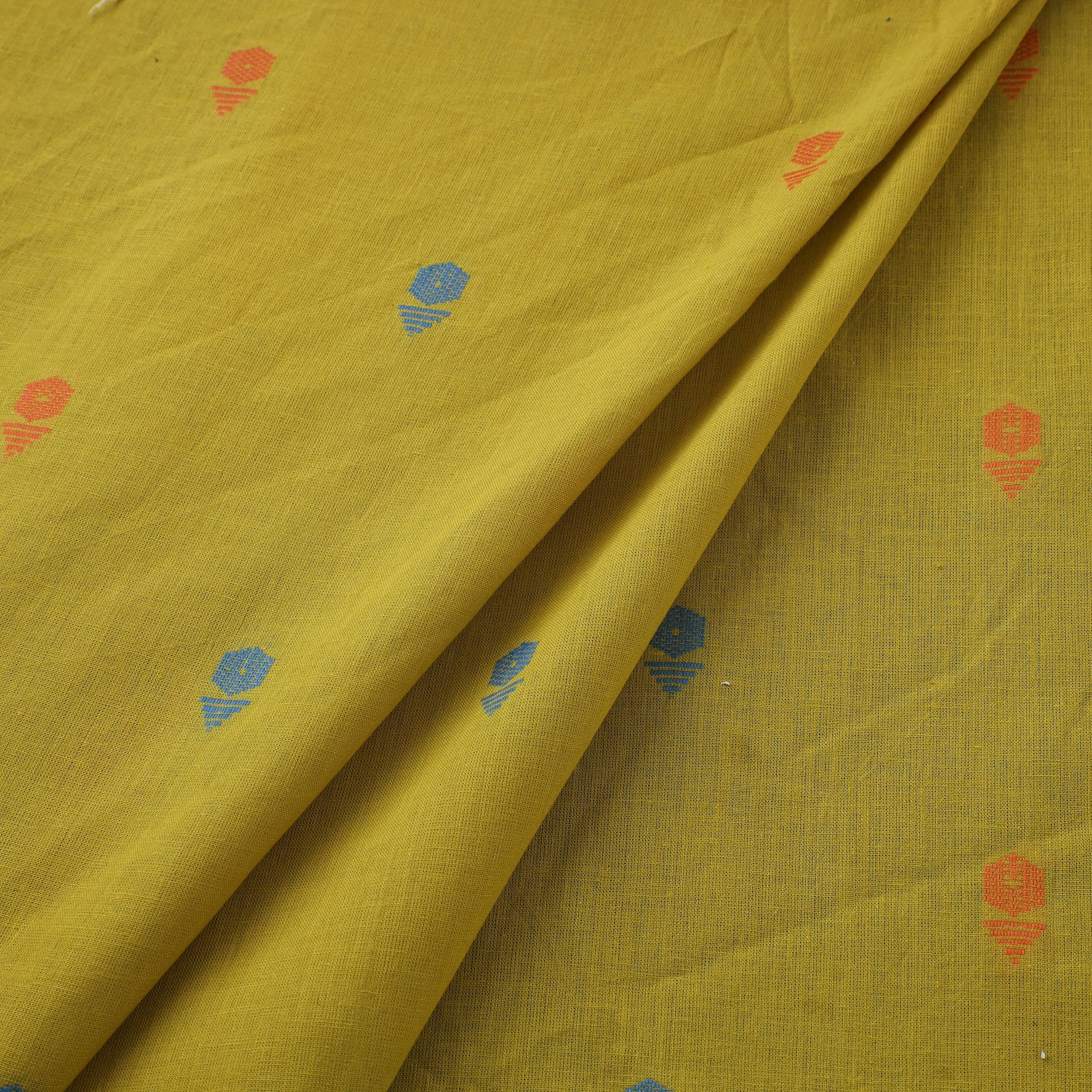 Woven in Tamil Nadu, this yellow jacquard cotton fabric features a traditionally inspired pattern crafted using a modern jacquard weaving technique. Its pre-washed finish offers a soft feel, perfect for making kurtas, dresses, or home décor accents. While machine-woven, it beautifully reflects the richness of India’s textile heritage.